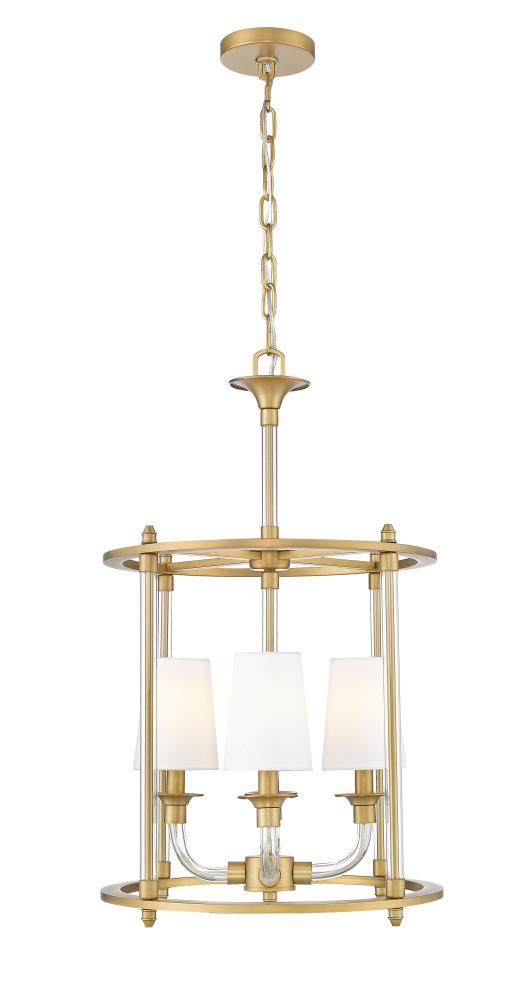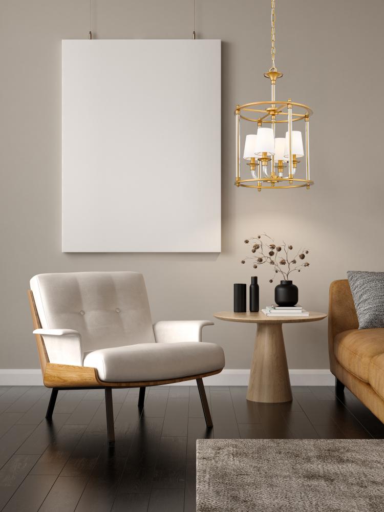 An open frame and tightly clustered lights create visual impact for this modern four-light chandelier. Beautiful over a breakfast nook or living room seating area, it features a rubbed brass finish and slim glass arms that impart sophisticated warmth and richness. The fixture is complete with four tapering shades in white fabric, casting softly diffused illumination over you space.