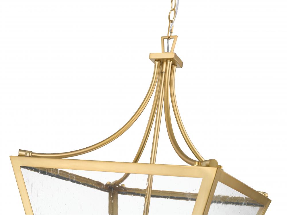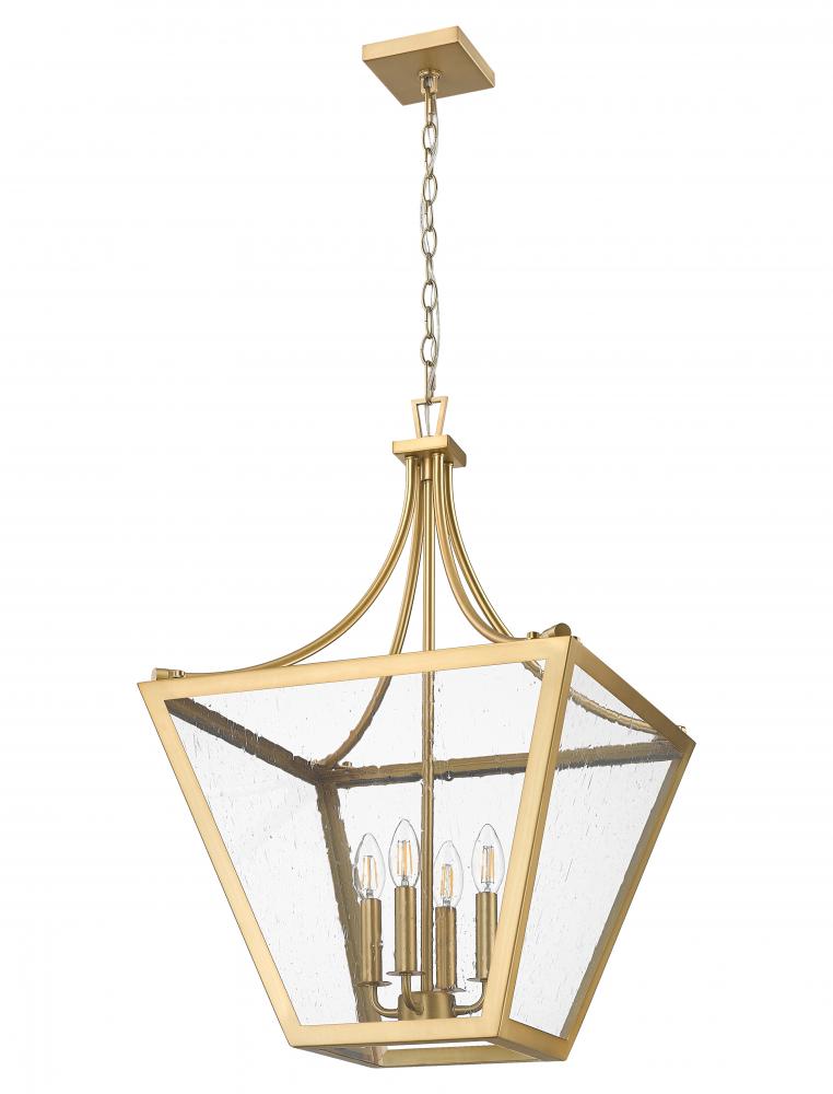 Whimsical and yet elegant, this four-light chandelier puts a new spin on conventional lantern style as it illuminates dining rooms, living rooms, and foyers. Rubbed brass finish steel framing and slightly seedy glass panels merge to create a chic silhouette, with interior candelabra bulb holders embellishing a charming vibe. This dimmable light delivers selectable levels of illumination to suit moods.