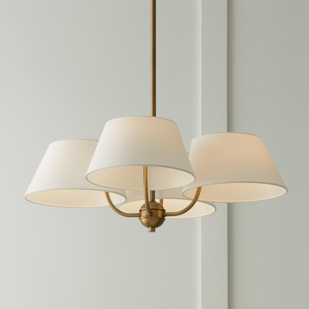 Angled shades create the ultimate sophistication with the Welsley Chandelier. The crisp white fabric drum shades get a geometric refresh and complement the warmth of the slender Aged Brass arms.