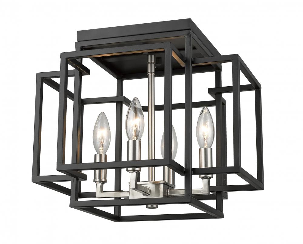 Sleek black and brushed nickel finishes grace the geometric style frame of this four-light flush mount light. Bring a crisp modern fixture to lower-height ceilings with the mixed motif personality of this steel-crafted light that showcases romantic candelabra-style bulb bases.