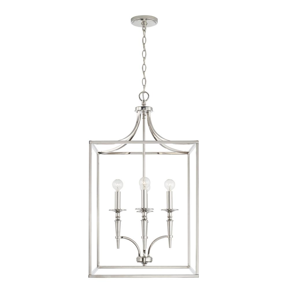 Straight edges and striking curves intersect in the Abbie 4-Light Foyer. The dramatic candlestick detailing in Polished Nickel brings a contemporary nod to the lantern design.