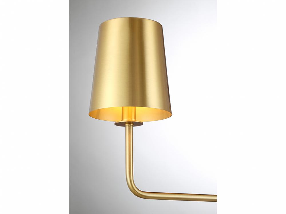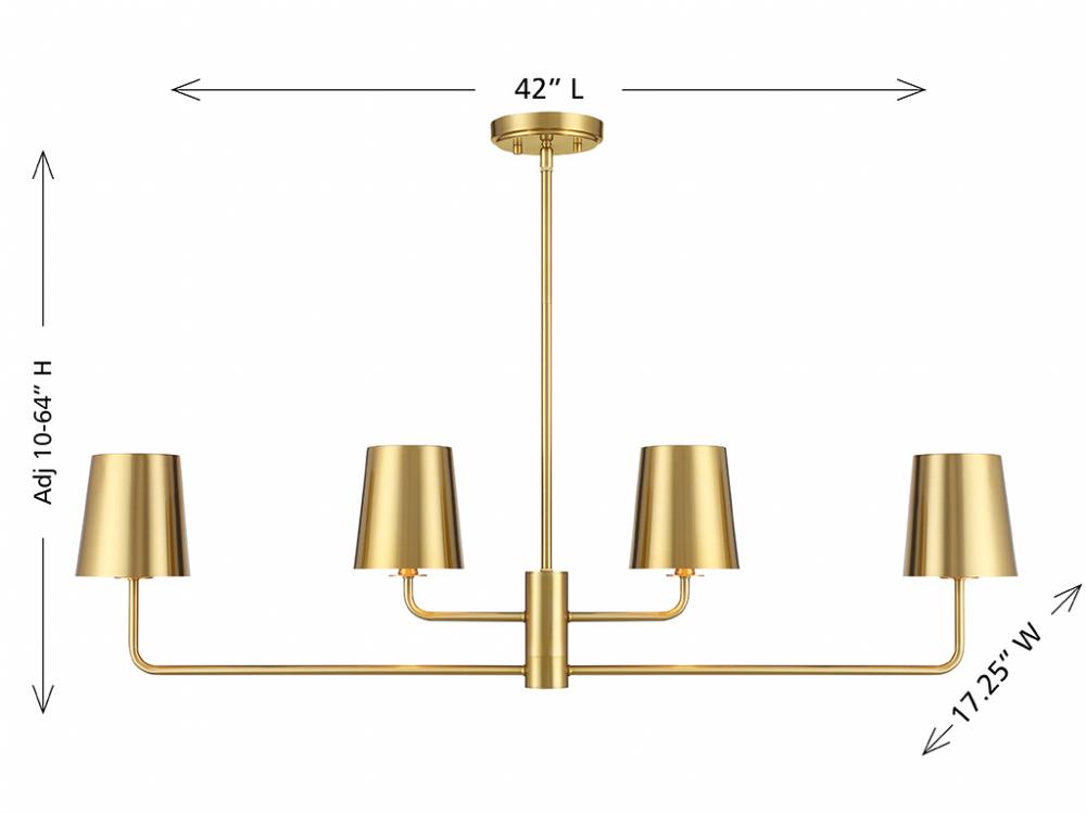 Heighten the drama in your home with this chic 4-light linear chandelier. The whole fixture, including the metal shades, is finished in Natural Brass for a glow that is boldly concentrated like a spotlight. Plus, you can adjust the two tiers of arms to really customize the look. This linear chandelier is 42" in length, 17.25" in width and has an adjustable height ranging from 10" to 64". It comes with four 12" downrods and one 6" downrod. Uses 4 standard size bulbs of up to 60 watts per bulb. Bulbs not included.