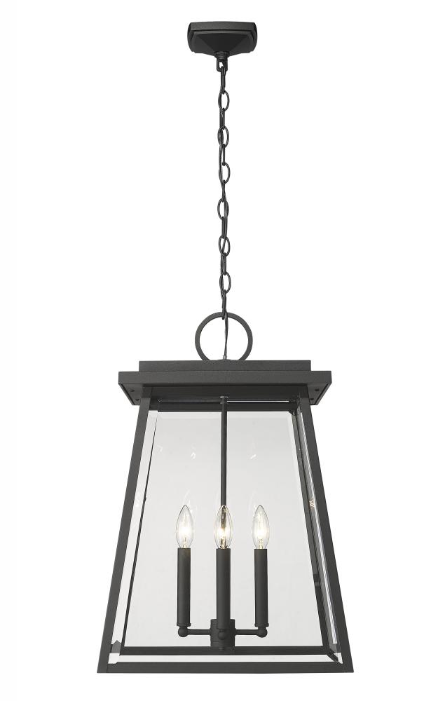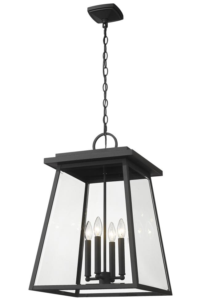 Treat an exterior space with as much attention to detail as interior d?cor, adding fashion-forward light fixtures to infuse elegance. This four-light outdoor chain mount ceiling fixture creates a romantic feel with candelabra bulb mounts visible from an angled lantern-style black aluminum frame with clear beveled glass panels.