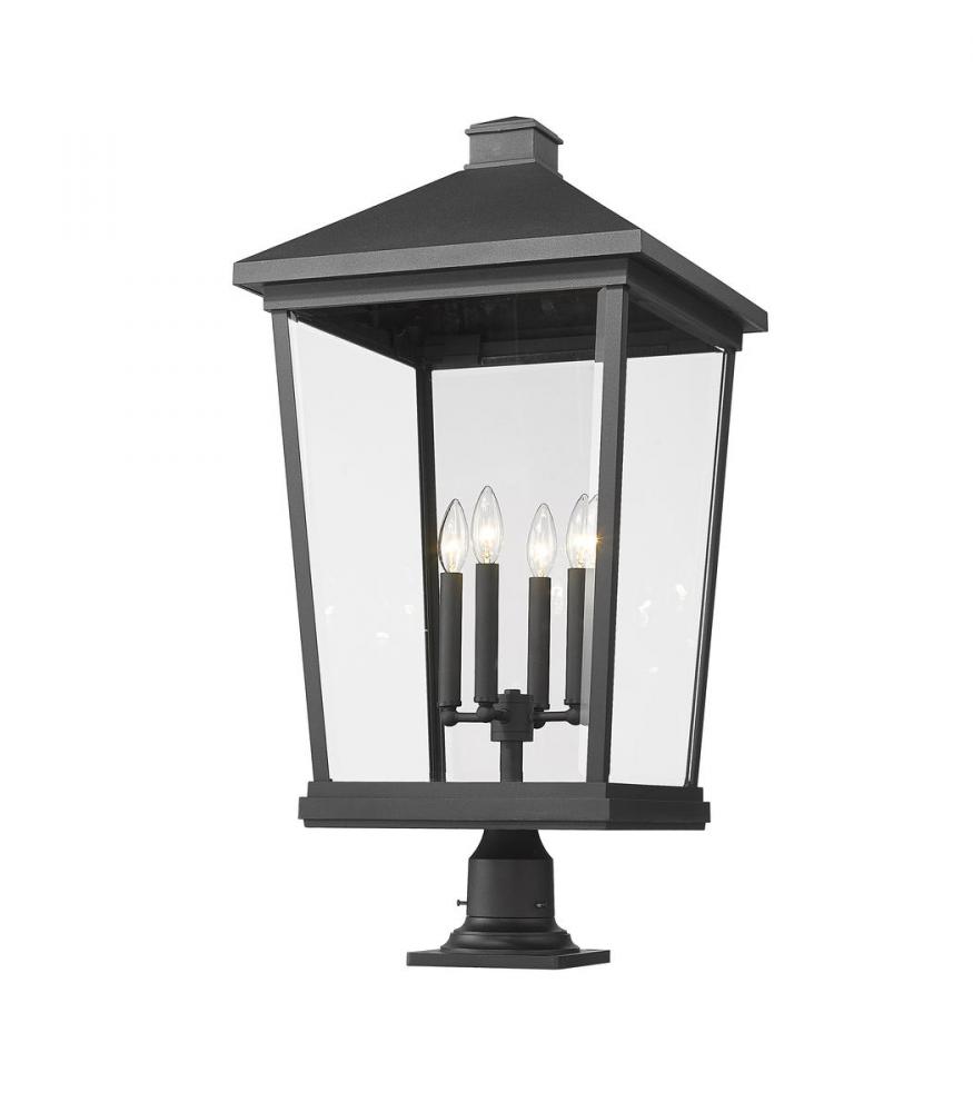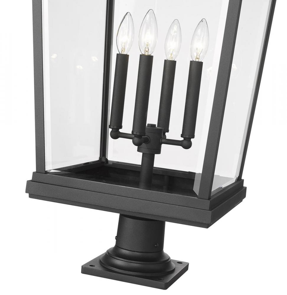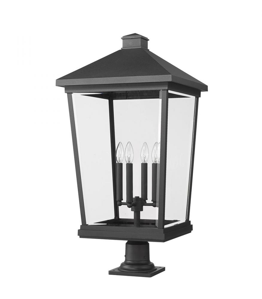 Embellish a custom garden space or walkway with a hint of village charm. This four-light outdoor pier-mounted light fixture creates a sophisticated and stylish form of ambient lighting and elevates the d?cor level to match carefully planned spaces. From the Beacon collection, this light offers a matte black finish aluminum housing unit dressed up with clear beveled glass that offers a peek-a-boo view of a romantic candelabra-style bulb base.