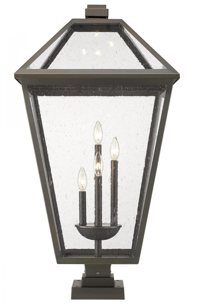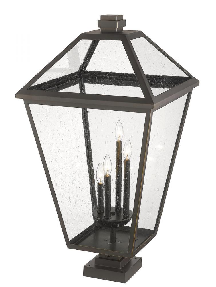 Careful landscape design efforts deserve embellishment, and the Talbot four-light pier mounted fixture delivers in a big way. A charming village motif infuses industrial-transitional style, blending a lantern silhouette frame and pier crafted of oil rubbed bronze stainless steel with a matching interior bulb cluster mount. Seedy glass panels offer a tasteful modern transparency.