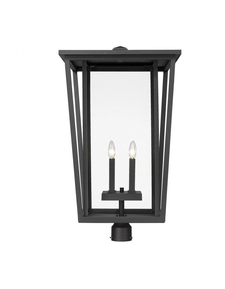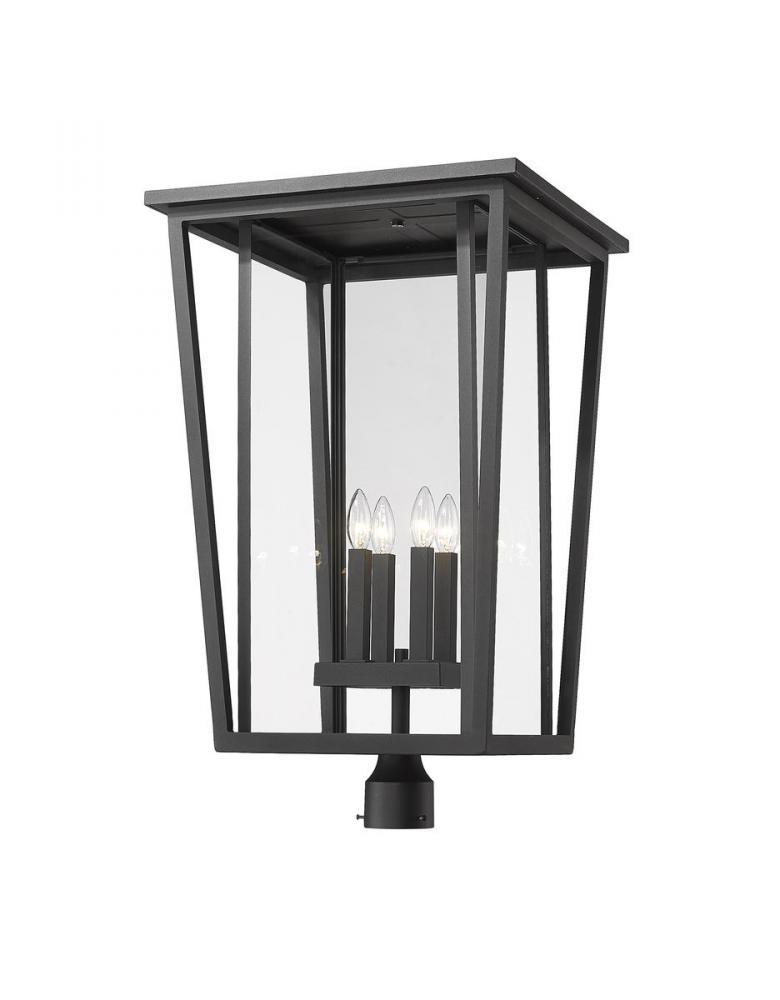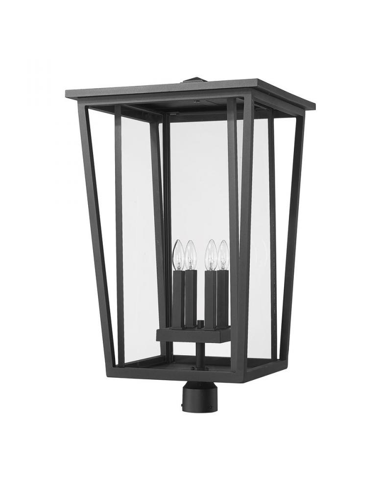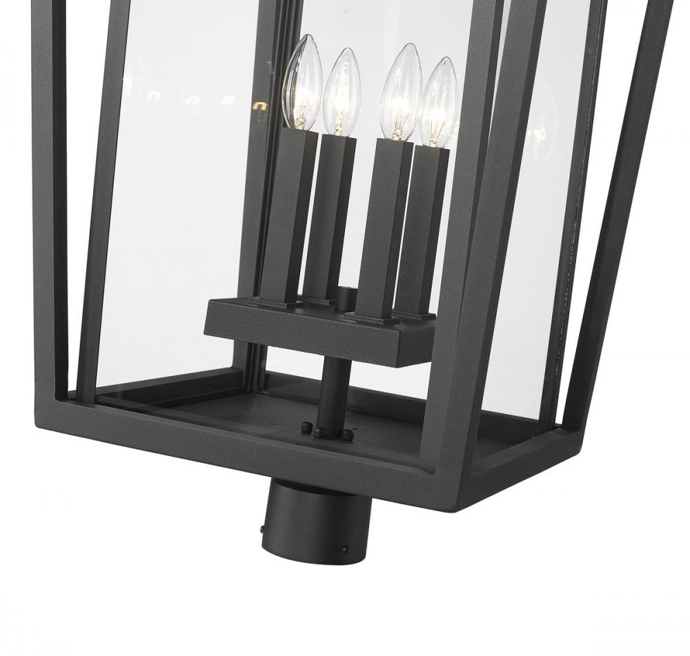 Top an exterior light post with a fixture that blends geometric energy with charming village-inspired essence. This four-light post mount fixture from the Seoul collection infuses minimalist geometric style in a black finish aluminum frame with angled accents. Specially cut clear glass panels offer a perfect view of a four-bulb base inviting romantic candelabra-style bulbs.