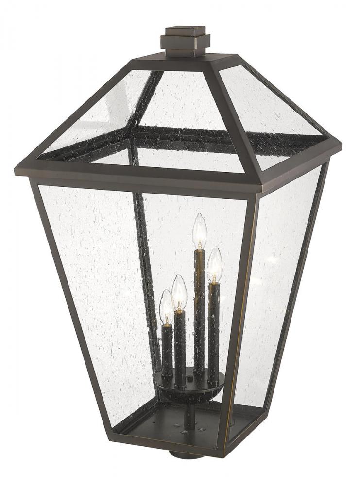 The Talbot four-light outdoor post mounted fixture offers a versatile style and mechanism to top existing posts in exterior pathways or walkways. Indulgent with a village theme, this transitional light fixture creates definition with a black finish, a stainless steel frame and elegant panels of clear beveled glass. An interior bulb mount cluster adds to the charming motif.