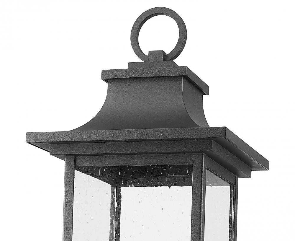 Made of aluminum and boasting a Black coastal finish that can stand up to harsh coastal environments, the Tiberius series of outdoor lanterns features an elegantly scrolled arm and flared detailing at the cap. Lightly seeded glass adds a transitional touch