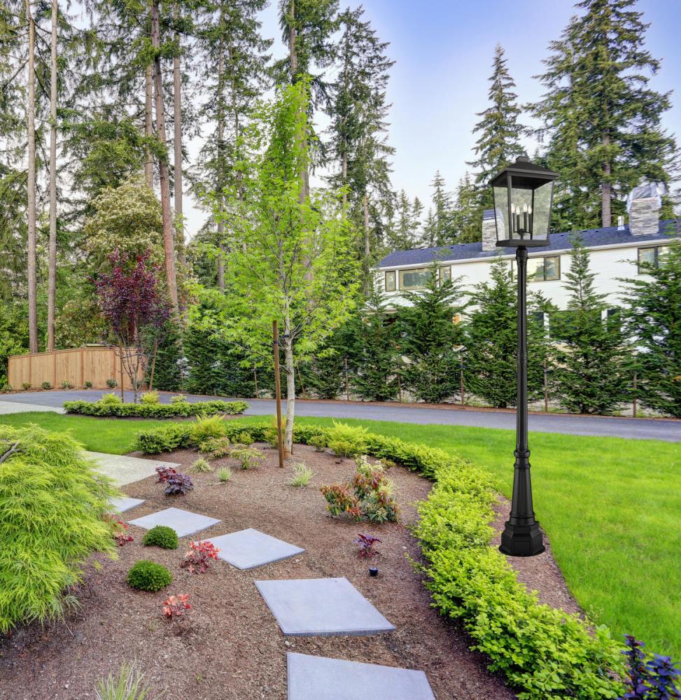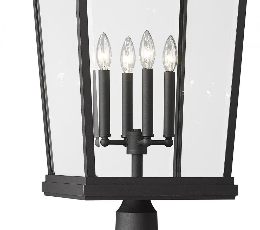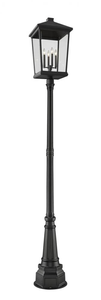 Custom crafting delivers a sophisticated village-inspired look to outdoor spaces, making this four-light outdoor post-mounted fixture from the Beacon collection a superb choice. Dress up a patio or walkway with a fixture crafted of matte black finish aluminum and clear beveled glass, with charming candelabra-style bulb mounts adding a romantic aesthetic. Nestled on an ornate, detail-oriented post, this light fixture adds elegance to any exterior space.