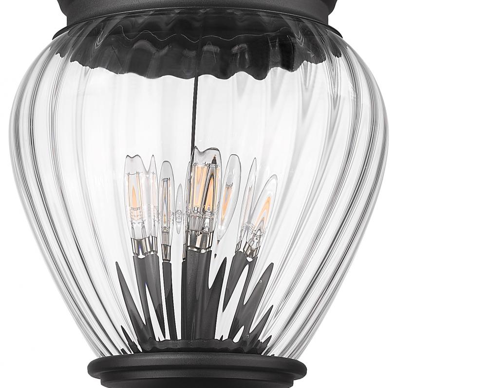 Exterior spaces deserve decadent lighting with a soft glow and sleek style. This four-light outdoor post-mounted fixture is a romantic feature, with a clean-lined pole paired with ornate accents that include a clear ribbed glass shade. With a smooth Coastal black paint finish, its dramatic impact is softened with charming gallery style and a gently contoured post.