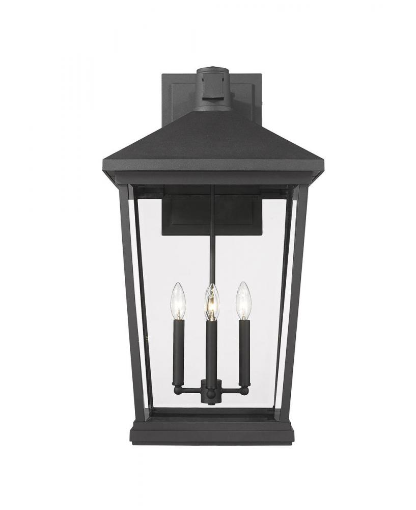 Sporting construction of bold matte black finish aluminum, this four-light outdoor wall sconce from the Beacon collection offers a village-inspired look with tons of charm. Mount this light to a home structure, gazebo, or pool house for a dose of sophistication. Clear beveled glass panels add a perfect view of a romantic candelabra-style bulb mounting unit.