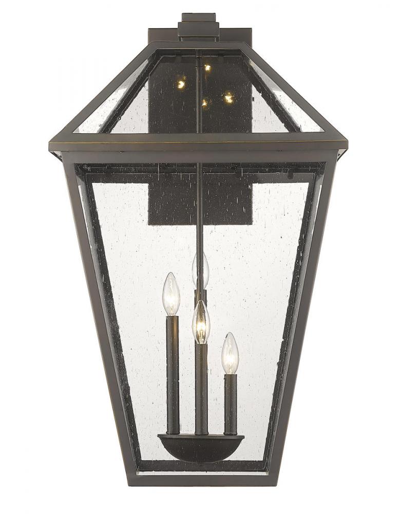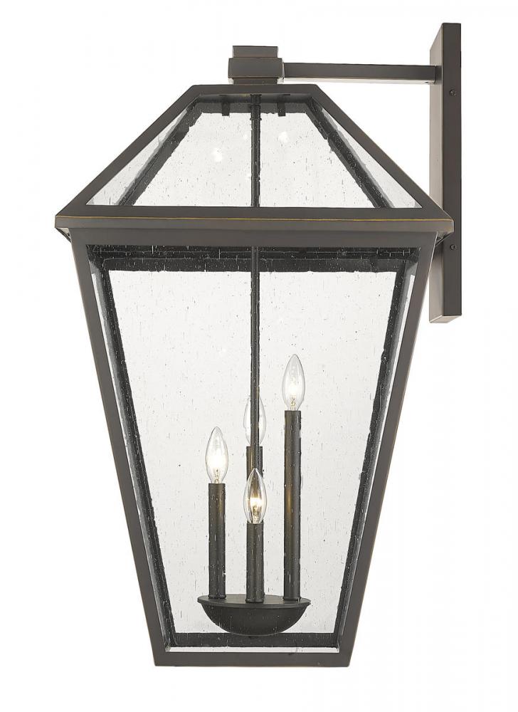 Bring a transitional and industrial inspiration to exterior spaces with the dynamic design of the Talbot four-light outdoor wall sconce. Illuminating a porch or deck with this tasteful fixture, it offers a lantern-like silhouette with a hint of village charm. An oil rubbed bronze finish stainless steel nestles panels of seedy glass, offering a full view of clustered slender bulb mounts, creating a symmetrical look that adds class.