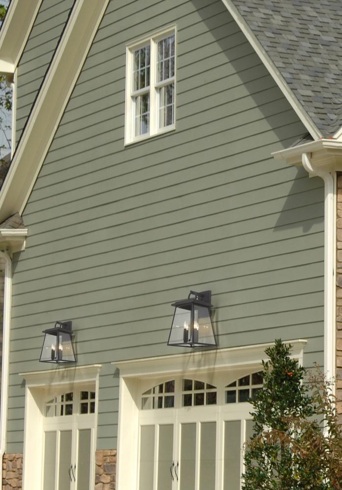 Modernizing the iconic village nautical motif, the Broughton four-light outdoor wall sconce delivers tasteful elegance and ambient lighting. This fixture creates a romantic feel with candelabra bulb mounts visible from an angled lantern-style black aluminum frame with clear beveled glass panels.