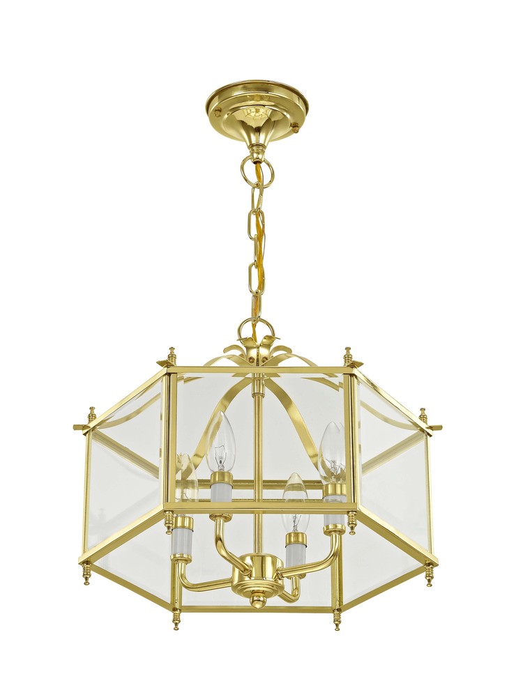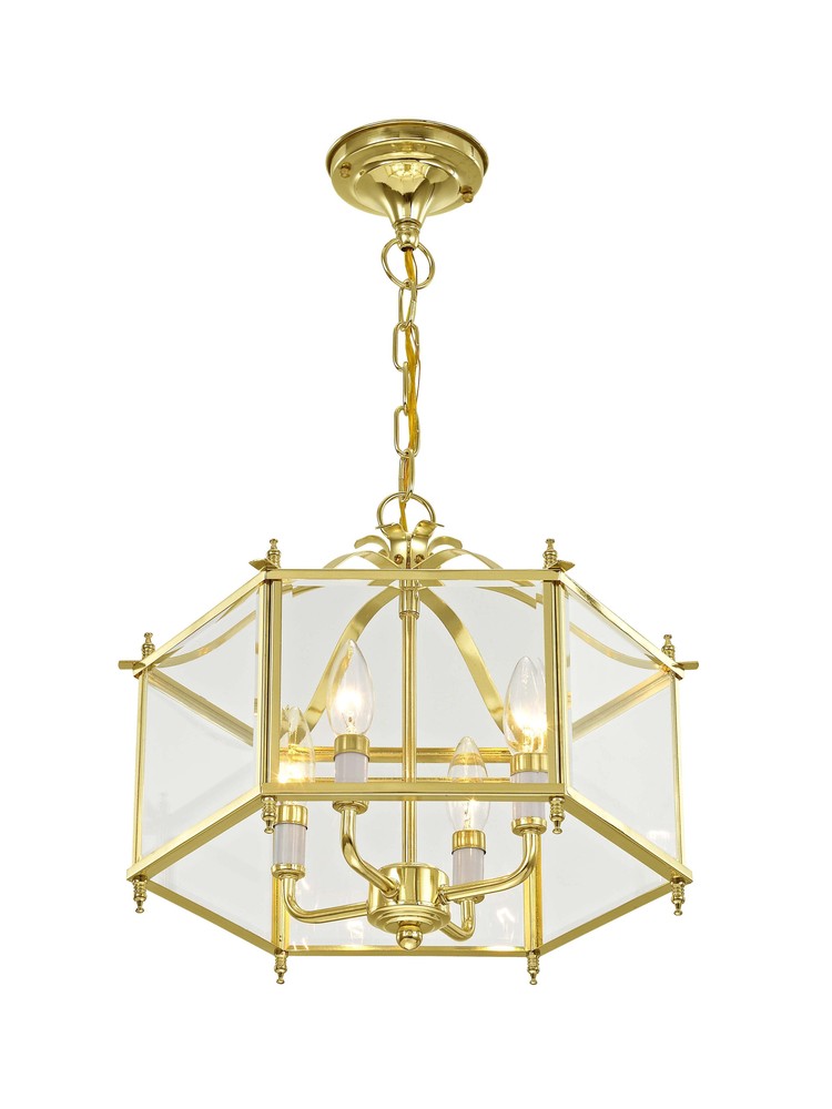 The Livingston Collection Features A Classic Six-Sided Lantern Silhouette. Polished Brass Finish With Clear Beveled Glass Gives The Fixture Charming Style And The Candelabra Bulbs Will Fill Your Home With Generous Amounts Of Illumination That Welcomes Your Guests. The Versatile Ixture Can Be Transformed Into Semi-Flush Ceiling Mounts.