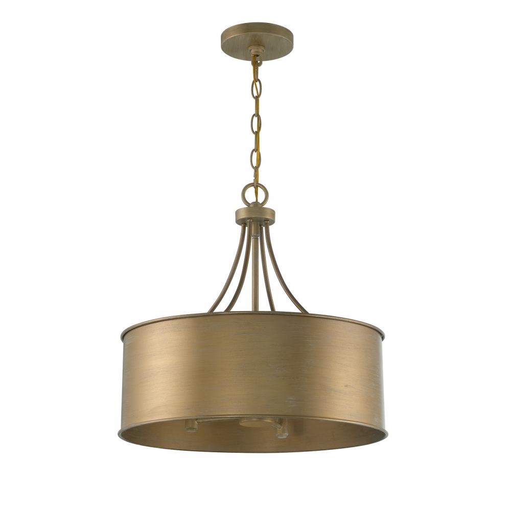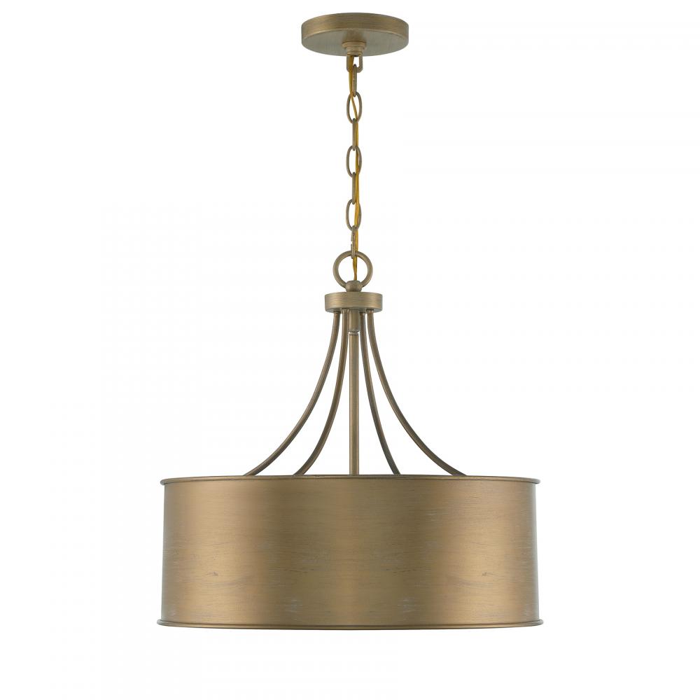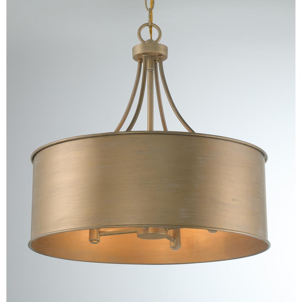 This 4-light pendant is the perfect way to bring timeless allure to any space. The drum-shaped solid metal shade, finished in Brushed Gold, creates an eye-catching and appealing glow. 17.5" height and 18" width. Uses candelabra size bulbs, max 60 watts per bulb. LED bulb compatible. Comes with 120" of chain.