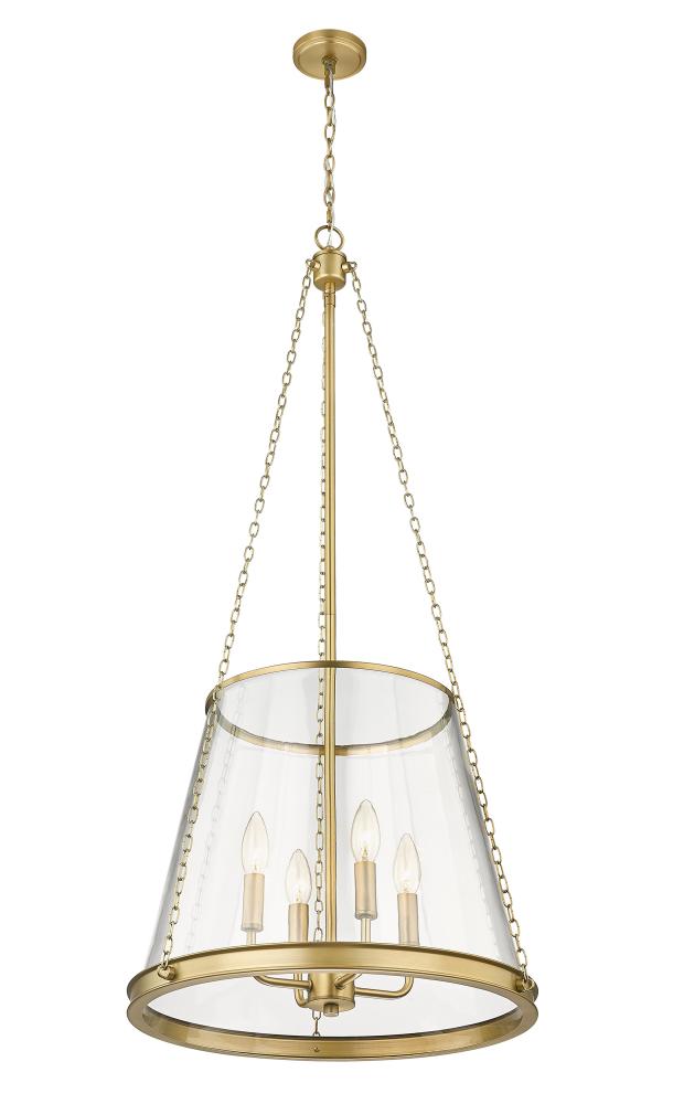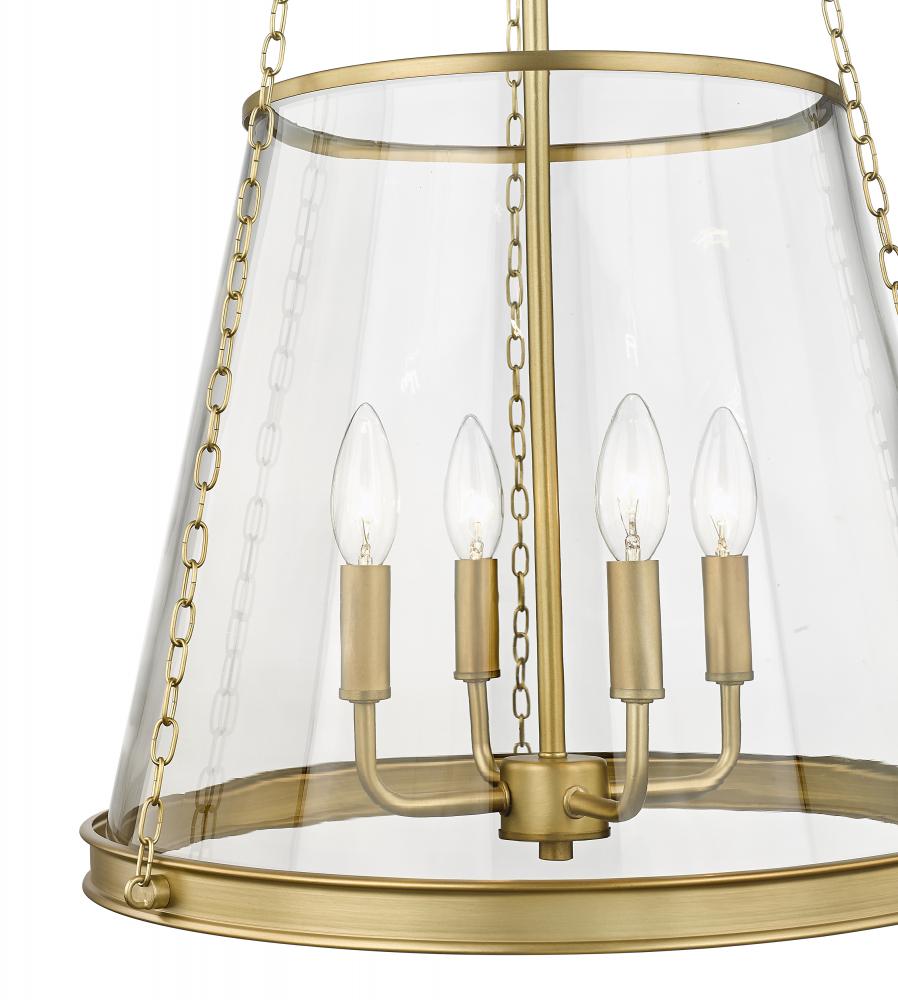 A contemporary take on an architectural restoration style classic, this transitional four-light pendant presents a warm rubbed brass finish that offers a luxe metallic touch to dining rooms and interior spaces. Perfect for spacious foyers and living rooms, this gorgeous four-light pendant creates a glamorous urban aesthetic and illuminates a space wonderfully with its four-arm candelabra style light that sits inside an elegantly tapered clear glass shade suspended by industrial style chain link supports.