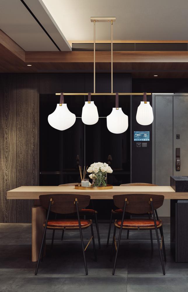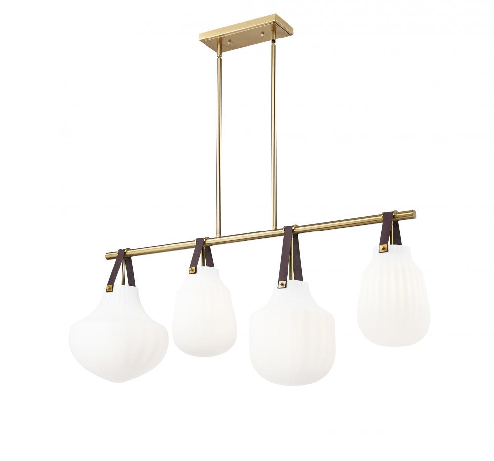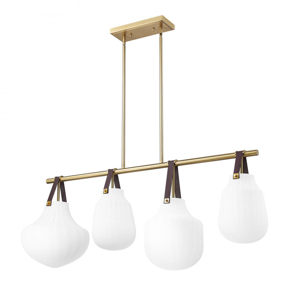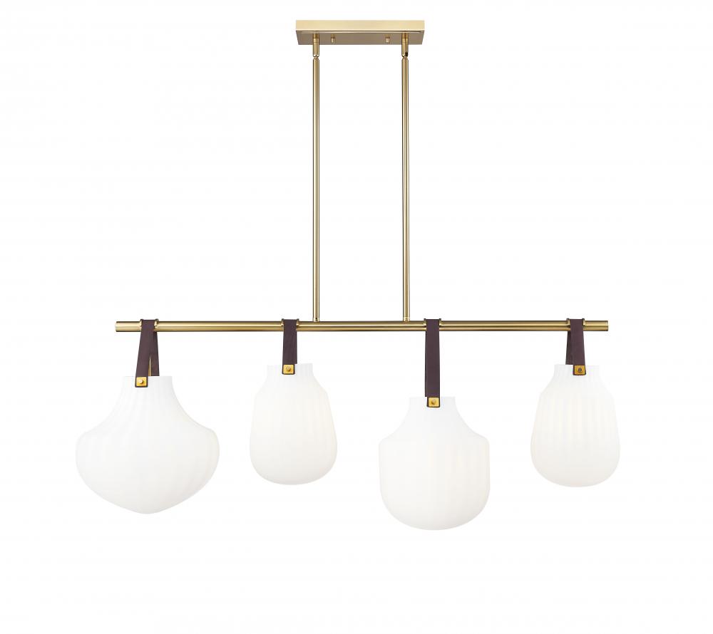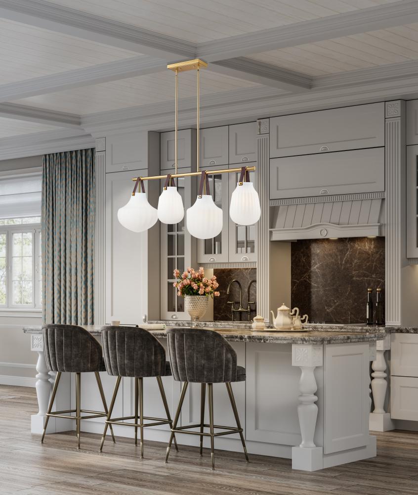 Leather straps suspend four individual ribbed glass shades to bring lively artisan character to a modern four-light linear pendant. Its fresh farmhouse appeal is juxtaposed with a sophisticated modern gold finish, creating depth and contrast perfect for a welcoming kitchen or dining room.