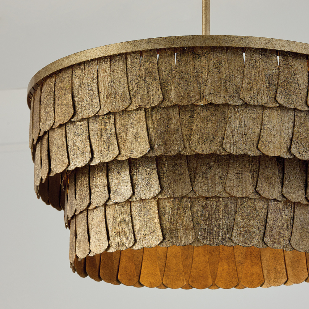 DETAILS: In a tiered drum silhouette, the curved metal dangling adornments create stunning dimension, accented beautifully by the heavy texture of the Ancestral Gold finish.