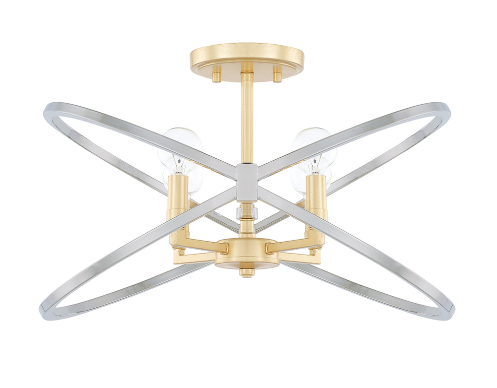 Inspired by gold and platinum jewelry, our two-toned Fire and Ice 4-light ceiling fixture makes a dramatic impact. Bring alive a kitchen, bedroom or living room with this modern design rendered in Polished Nickel and hand-applied gold leaf. The reflective metallic surfaces enhance the light cast by its four lamps.