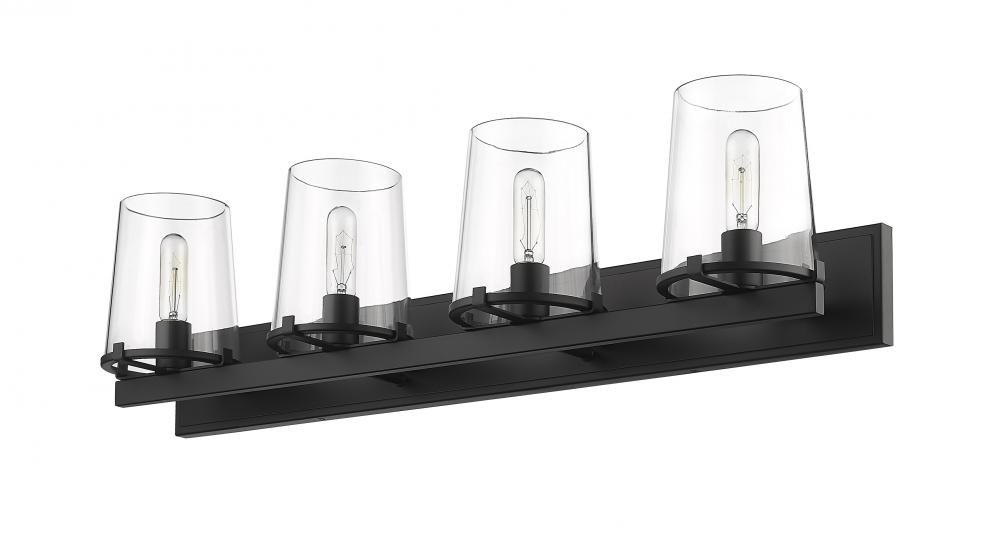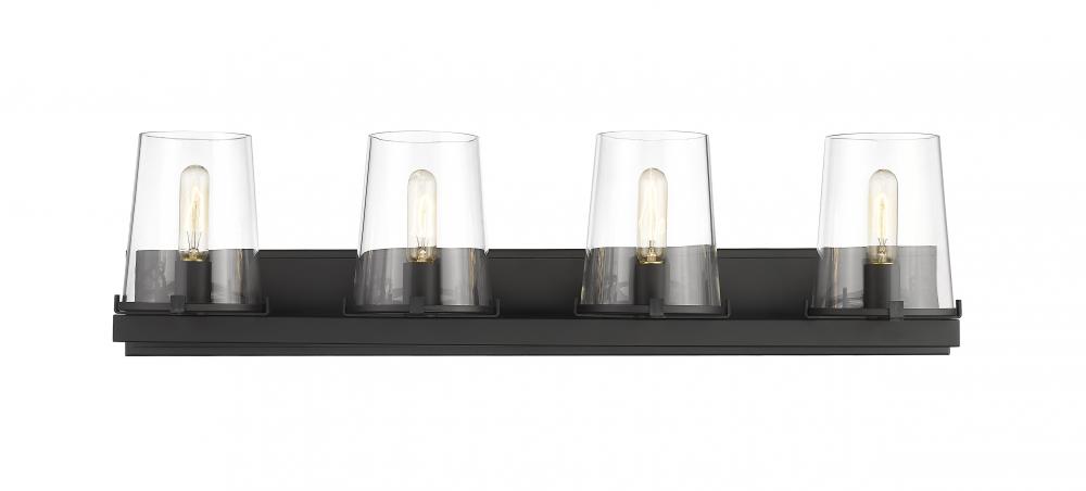Fashioned of hand-crafted steel and delicate glass, the Callista four-light vanity light frames a bath vanity space with precision and sophistication. Introduce a motif blended of village fare and nautical inspiration to add a tasteful lift for transitional and modern design schemes. Clean styling features a rectangular matte black finish steel frame and wall mount and four tapered clear glass shades, delivering a contrasting yet versatile look that works in a number of settings.