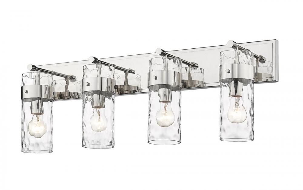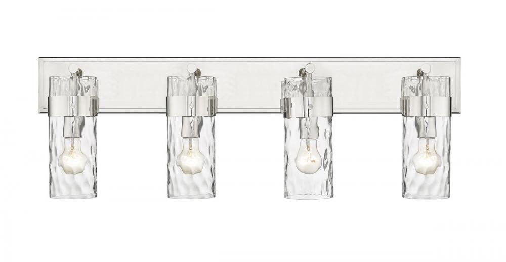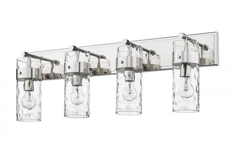 Deliver a sophisticated appearance in hallways and bathrooms with a four-way vanity fixture in polished nickel. The rippled texture of the glass shade provides a romantic ambiance, while the cylindrical shape offers an alluring appeal.