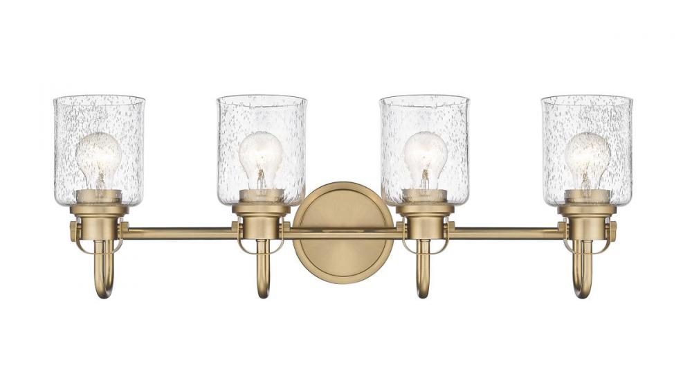 This four-light vanity fixture in heirloom gold provides a playful way to include metropolitan style to your hallway, bathroom, or bedroom. The cylindrical shade with a seeded glass top is made of steel, offering an ambient glow.