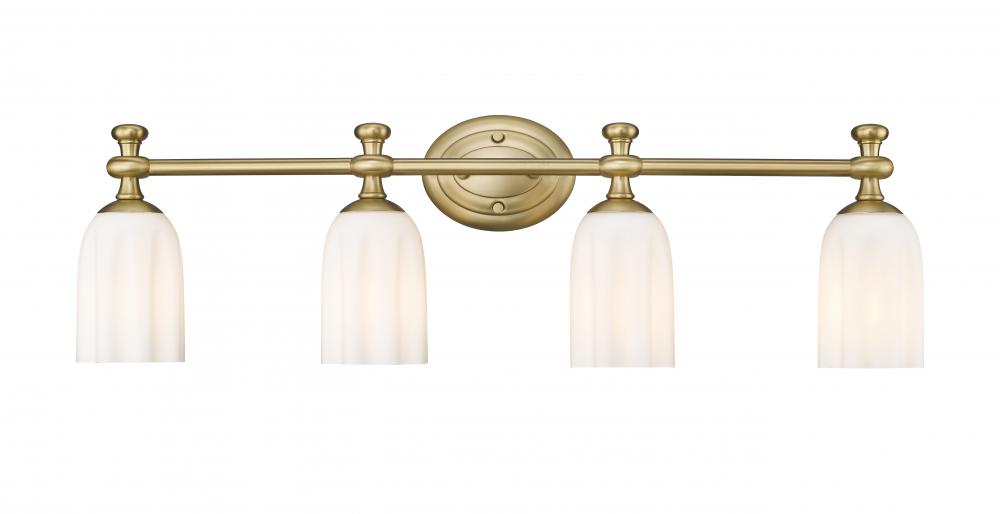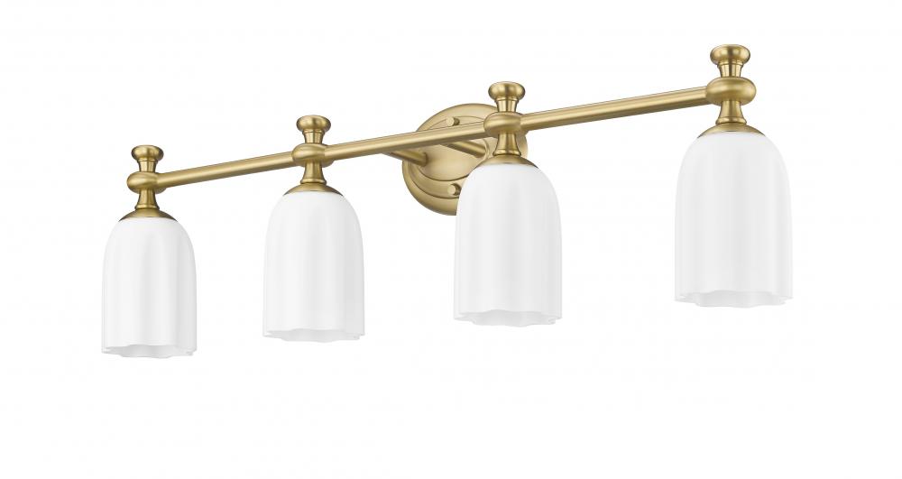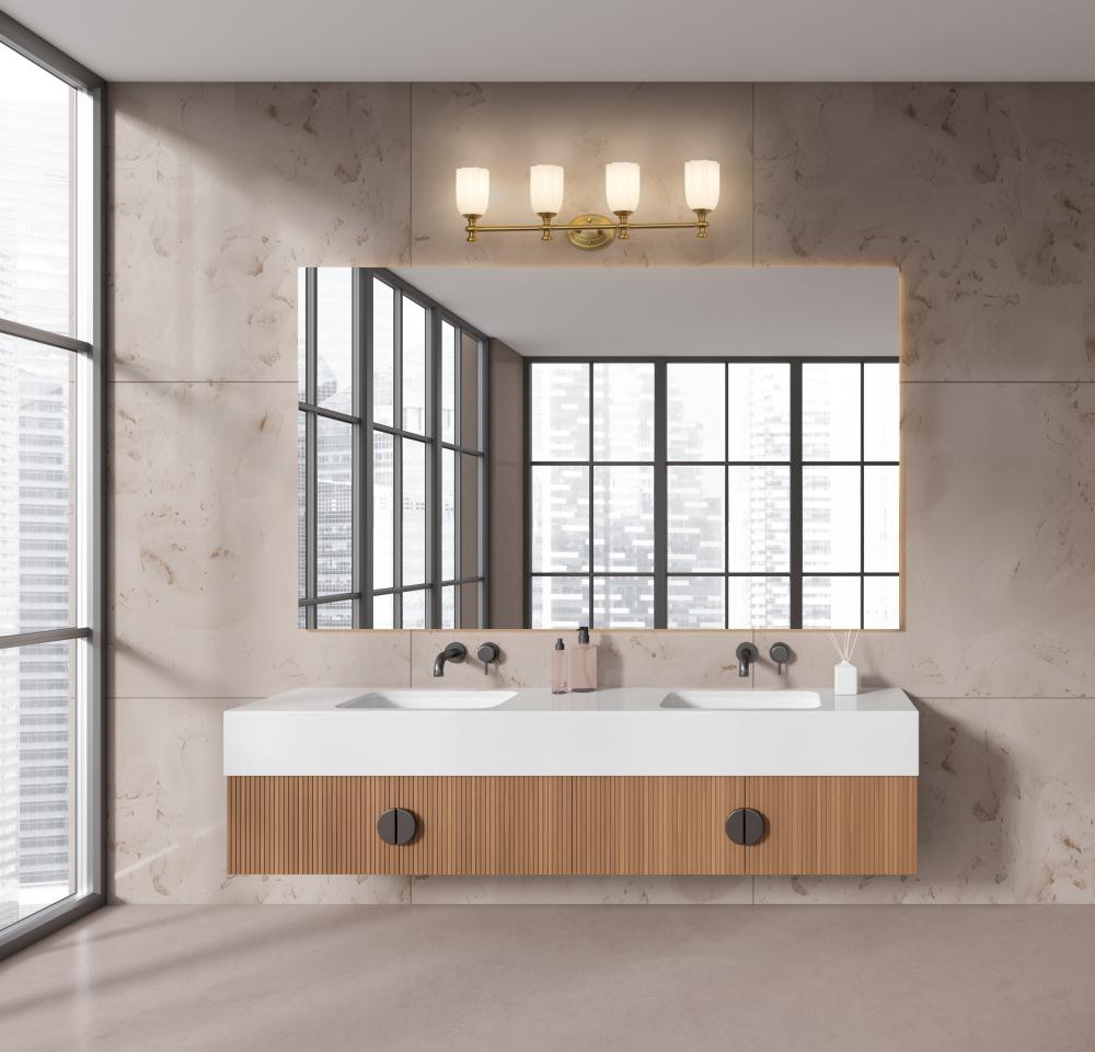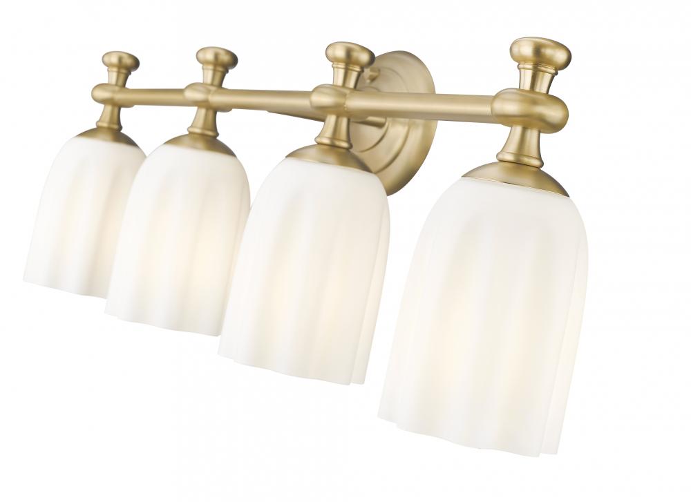 Appreciate the delicate design and warm modern gold finish featured on this modern four-light vanity fixture. Designed to elevate surrounding decor, it boasts a decorative oval wall plate and flourishes over its shades, creating a refined look and feel over any vanity. Opal etched glass is delicately scalloped to create a touch of movement and energy, ideal for a sophisticated bathroom space.