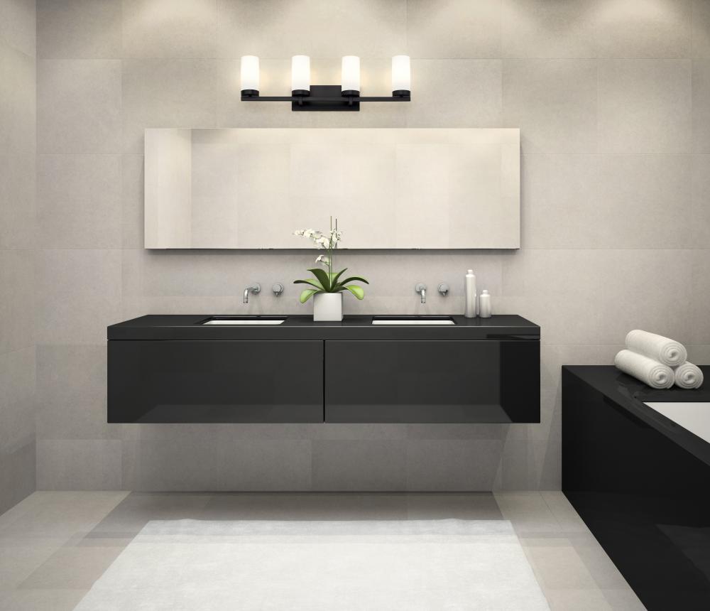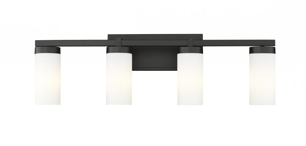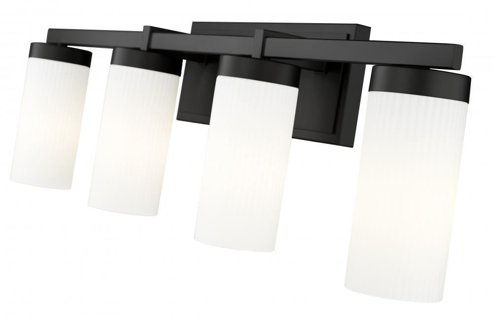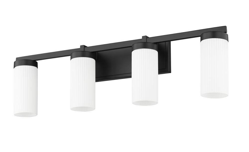Four lights mean a generous size for a modern vanity fixture that sets the tone over a sink or makeup table. Its fresh design features clean, robust lines paired with a rich matte black finish. Cylindrical shades feature white glass, creating soft, diffused illumination for all your beauty and grooming needs.