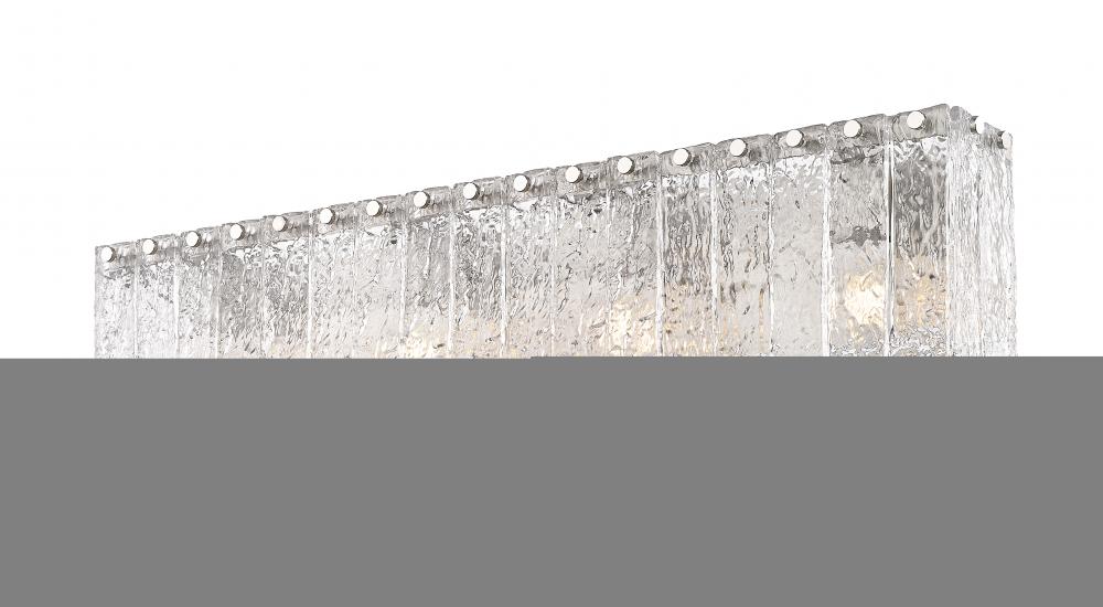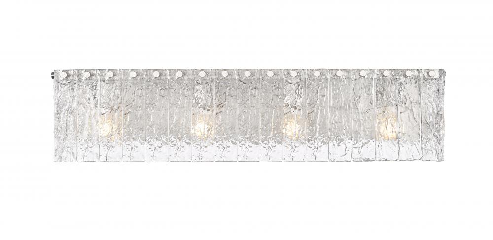 Elegant panels of icy textured glass bring radiant energy and sophistication to a modern four-light vanity bath light. Its minimalist steel frame virtually disappears, with brushed nickel finish details that add understated flair. It?s the perfect centerpiece for your contemporary guest or primary en suite.
