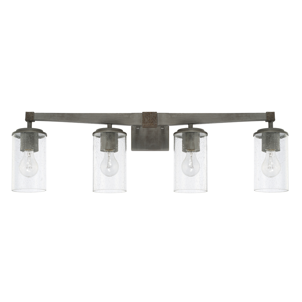 The Zac 4-light vanity brings visual interest, texture and industrial vibes to the bath. An angled, tapered frame supports cylindrical, Seeded glass shades. Brackets featuring a hammered texture accent the frame. This bath vanity light is finished in Urban Grey-- a signature two-tone finish that combines a visually distressed silvery grey with an antiqued, textured, darker grey featuring silvery highlights, for a touch of optical intrigue.