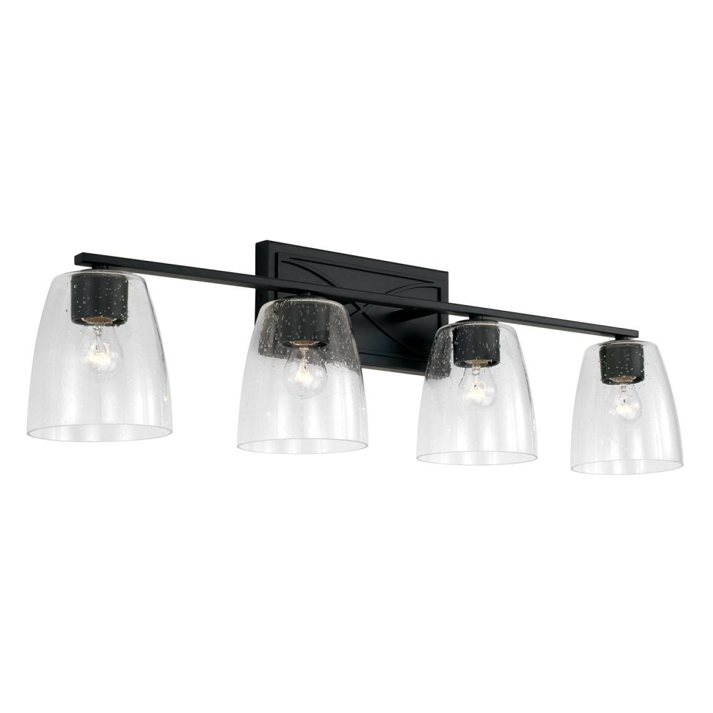 The curved x detailing on the backplate of the Sylvia 4-Light Vanity makes a stylish statement. The Matte Black finish complements the seeded glass shades.