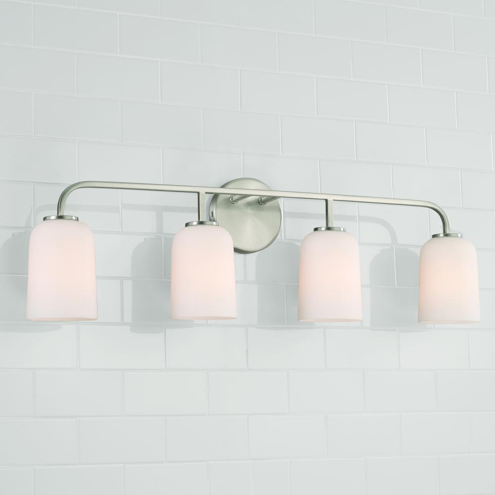32.25"W x 9.75"H 4-Light Vanity in Brushed Nickel with Soft White Glass
