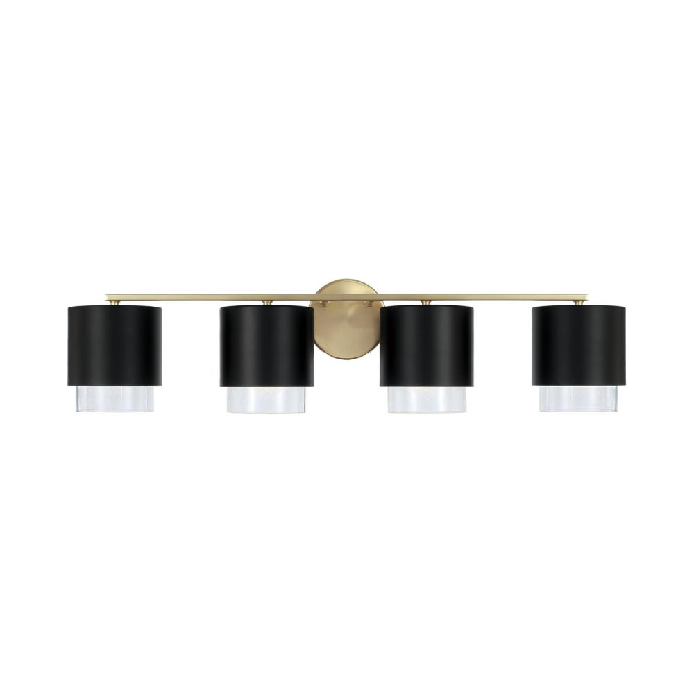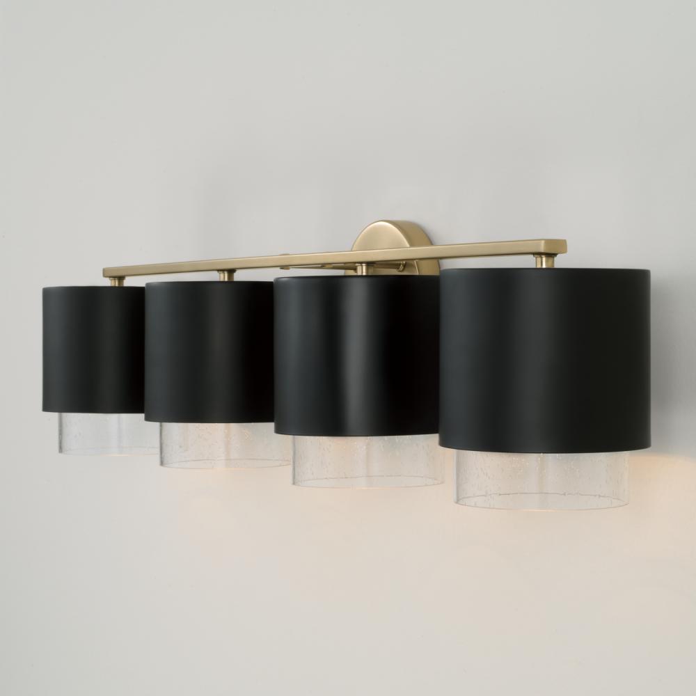 Contemporary forms meet illuminated elegance. The Weller 4-Light Vanity combines sleek, cylindrical silhouettes with seeded glass to cast a unique powder room glow. The Matte Black finish with painted Matte Brass interior brings mixed metal intrigue and a hint of shine.