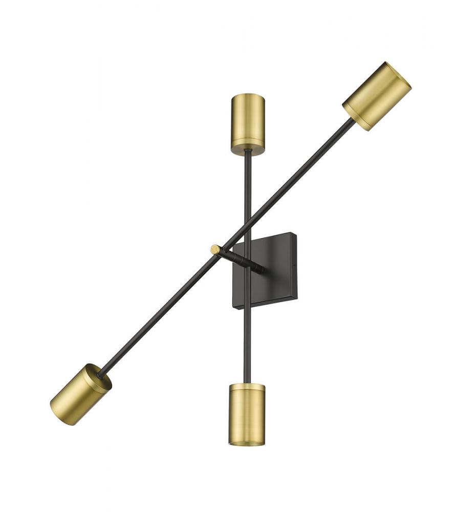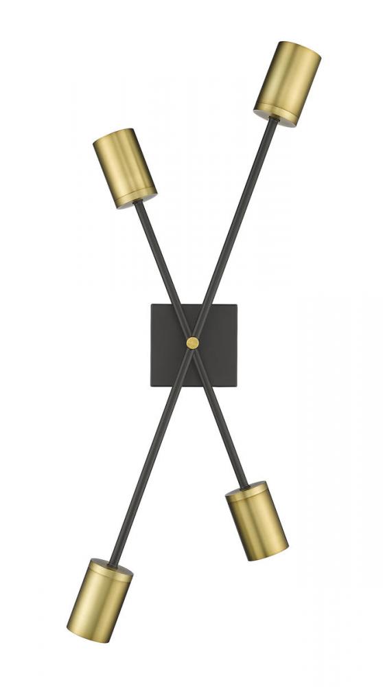 Linear and minimalist design takes a taste of the dramatic with a four-light wall sconce from the Calumet collection. This fixture?s aesthetic has roots in a Native American tribal motif, making for a delectable, expressive way to add ambient, targeted lighting. Cross-positioned arms and a square wall mount made of bold matte black finish steel are end-capped with warm olde brass finish steel shades that send light in an upward and downward direction.