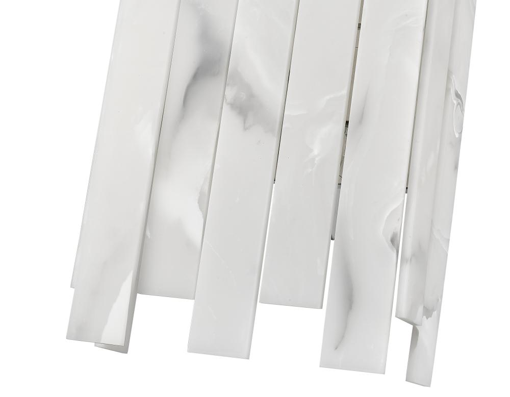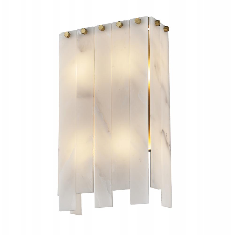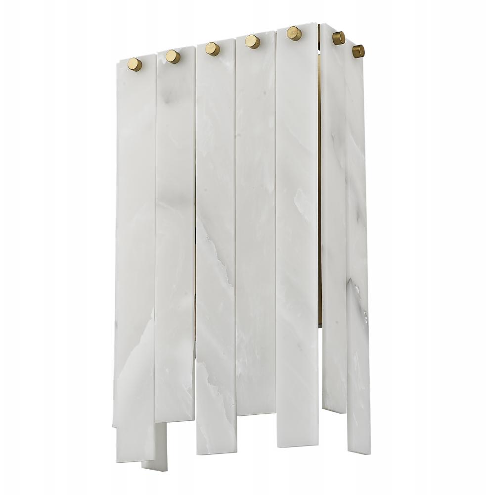 Attention to detail takes on the romantic allure of Art Deco influence when this stunning fixture transforms a custom space. This four-light wall sconce from the Viviana collection creates impact with alabaster-like strips alternating in length and arranged around a rectangular rubbed brass finish steel frame. Dressed up with whimsical rivot detailing, this sconce goes with the flow as it complements a gritty rendition of toned-down glam in a main living setting, en suite, or bedroom.