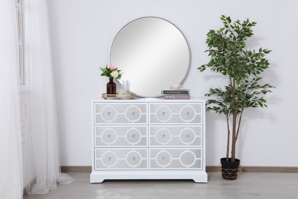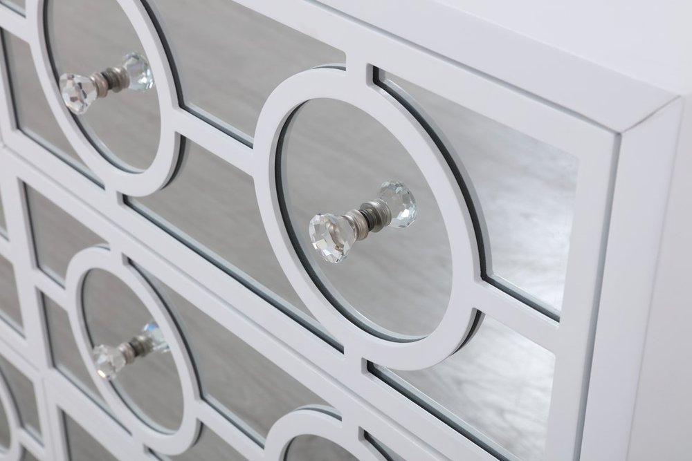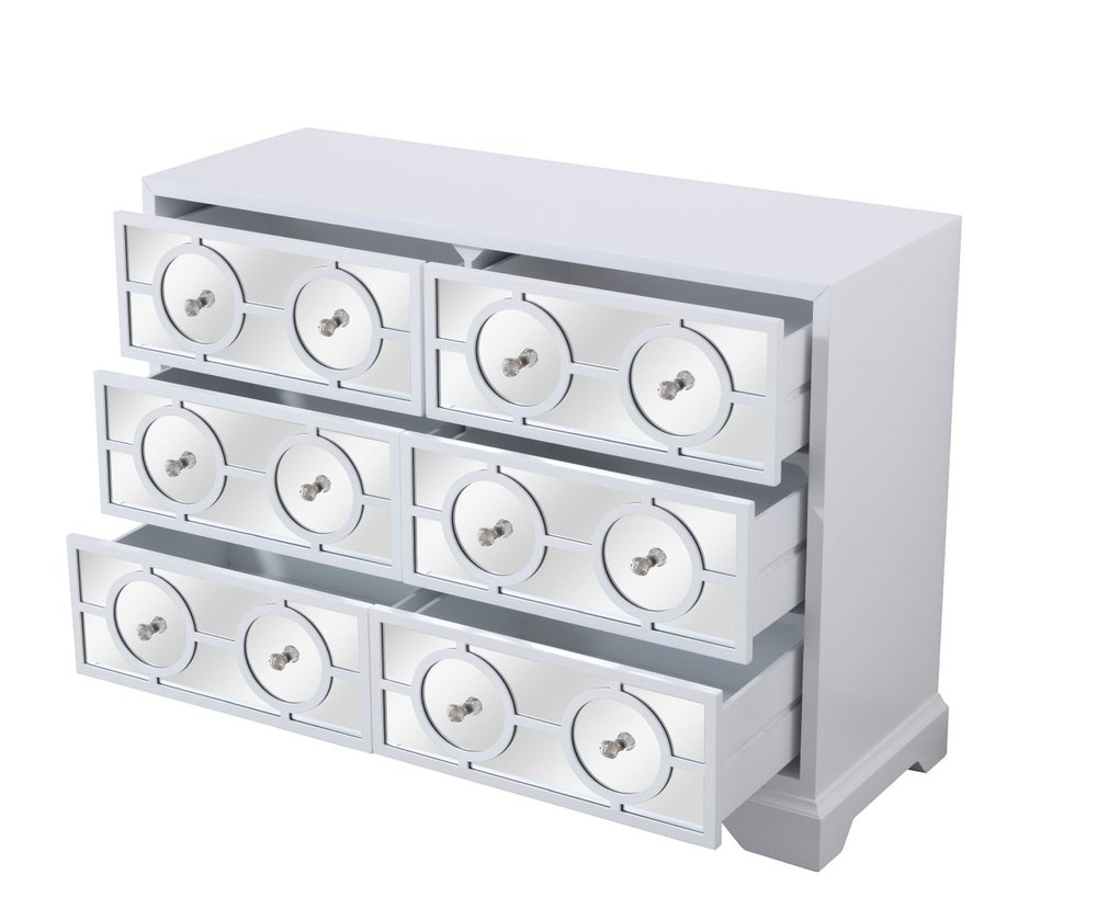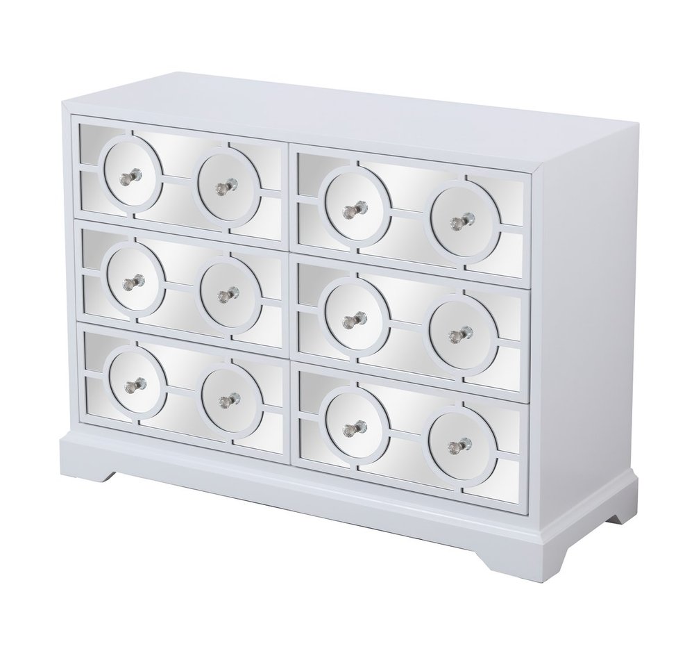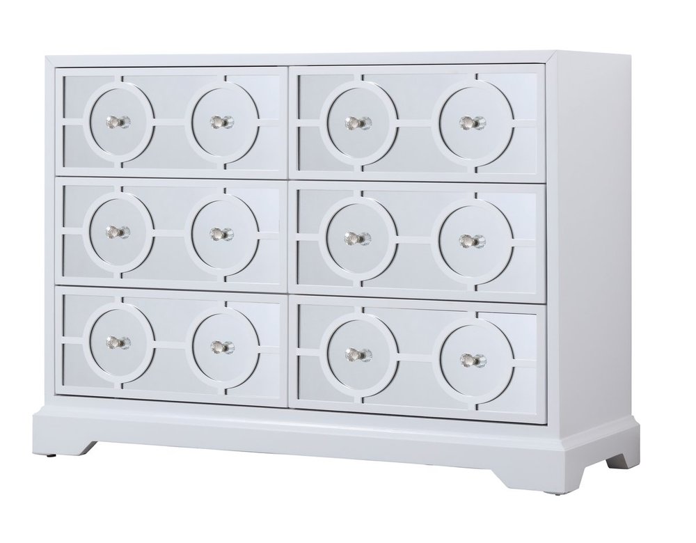 Sophisticated with a reflective touch, this 48” wide transitional furniture piece adds style and functionality to your room. Hand painted in white with six deep drawers provide ample storage space, each decorated with 2 sparkling crystal knobs. Distinctively designed in beveled mirror with circle overlay. This beautiful piece enhances the ambience in your room.