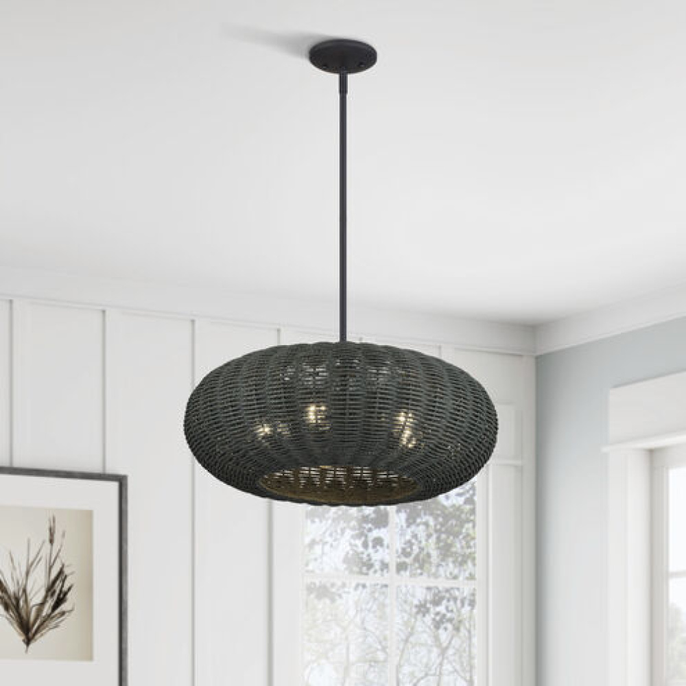 Surrender to one of life’s simplest yet most essential pleasures – soft lighting – with the ambient transitional Deluna lighting collection. This versatile, rustic-inspired design features minimalist metal frames and elegant mandarin-shaped – handwoven with the remarkably durable and water-resistant paper rope material, finished in midnight black. Delivers organic-feeling, gently diffused illumination with atmospheric shadowing.