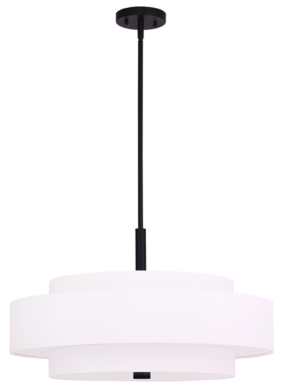 A Triple Drum Shade Adds Character To This Handsomely Styled Pendant Light. Update Your Decor With The Clean Styling Of This Contemporary Five Light Pendant From The Meridian Collection. Features A Lovely Hand Crafted Off White Fabric Hardback Shade And Frosted Diffuser For Subtle Illumination.
