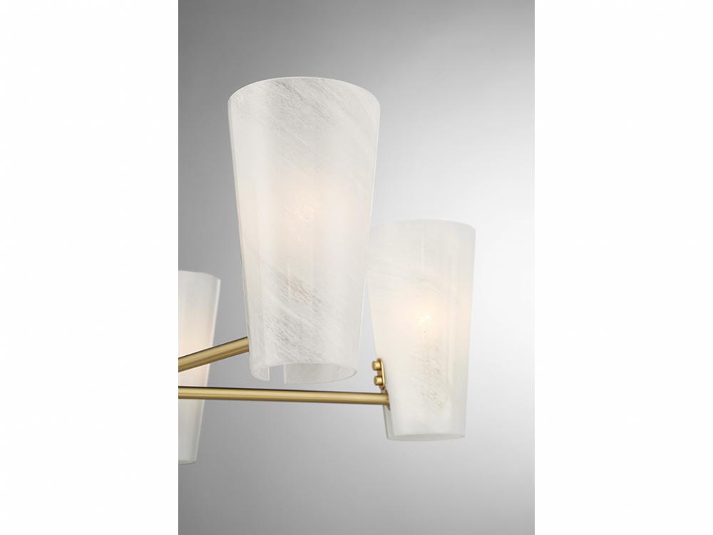 This 5-light chandelier takes mid-century modern style and gives it a fresh, magical twist with shades of strie glass featuring dazzling swirls that draw the eye, soften the glow and work beautifully with the Natural Brass finish. The chandelier is 30" in width and has an adjustable height ranging from 8.25" to 62.25". It comes with four 12" downrods and one 6" downrod. Uses 5 candelabra size bulbs of up to 60 watts per bulb. Bulbs not included.