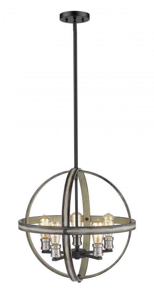 Full of industrial charm, this five-light pendant light brightens up entryways and living rooms. With an open geometric frame constructed of faux barnwood, the sleek silhouette highlights exposed lightbulbs along a distressed ashen hue.