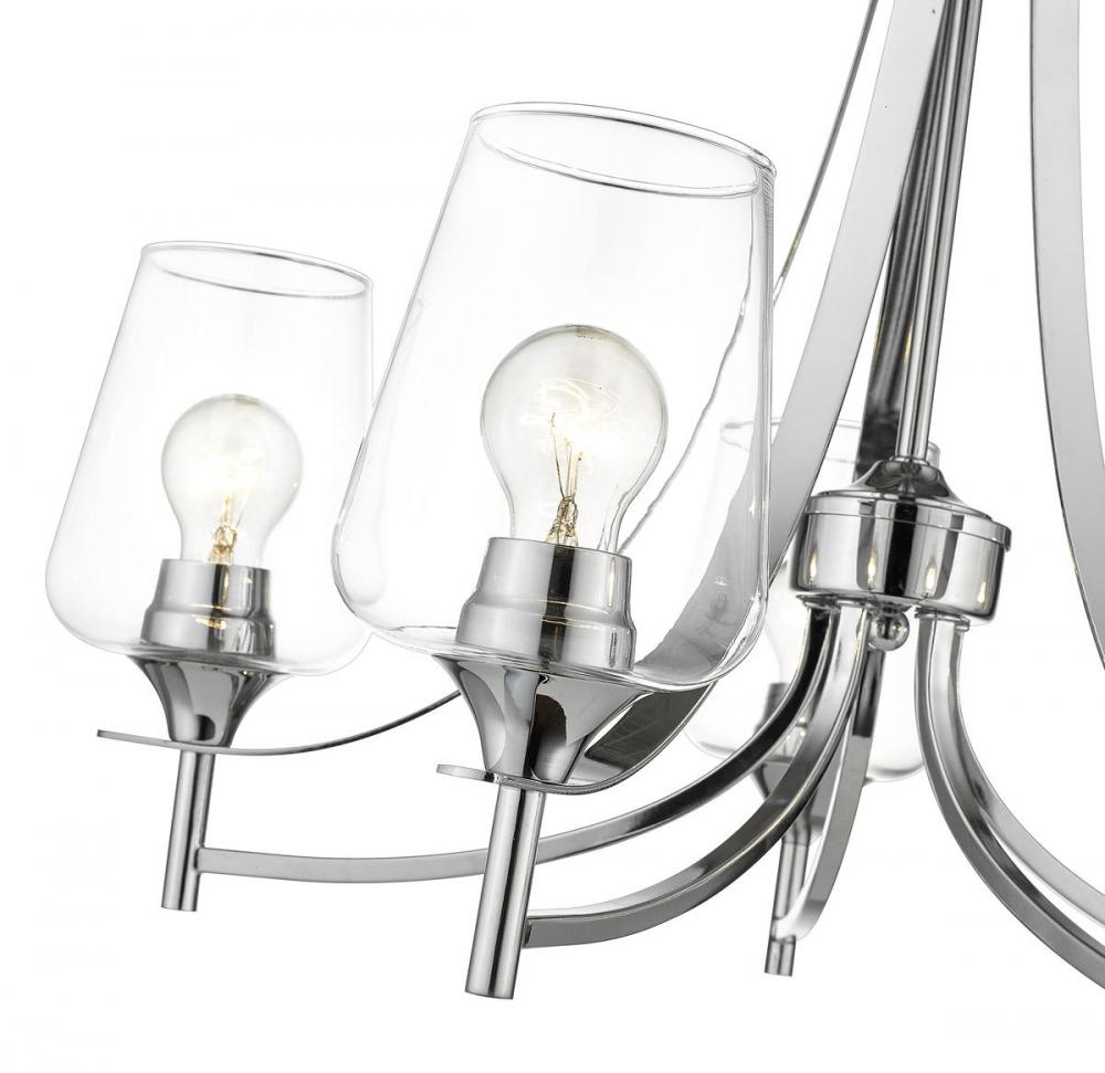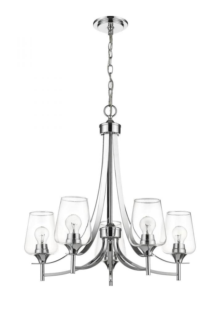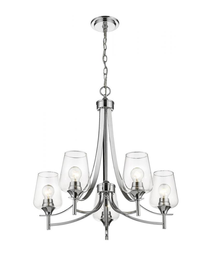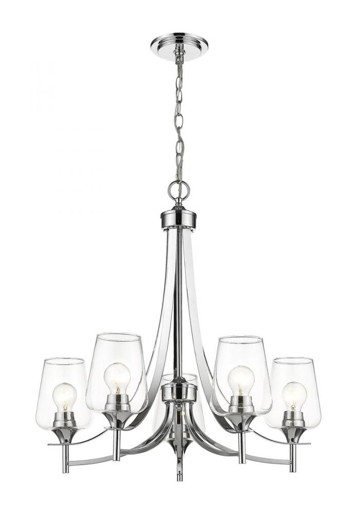 Highlight a sophisticated dining space, kitchen, or living area with this chrome finish steel five-light chandelier from the Joliet collection. A modern vibe employs artisanal design elements in a chandelier featuring a romantic circular frame crafted of chrome finish steel with tastefully flared arms. Five delicate clear glass shades deliver pristine character with upscale, custom style.