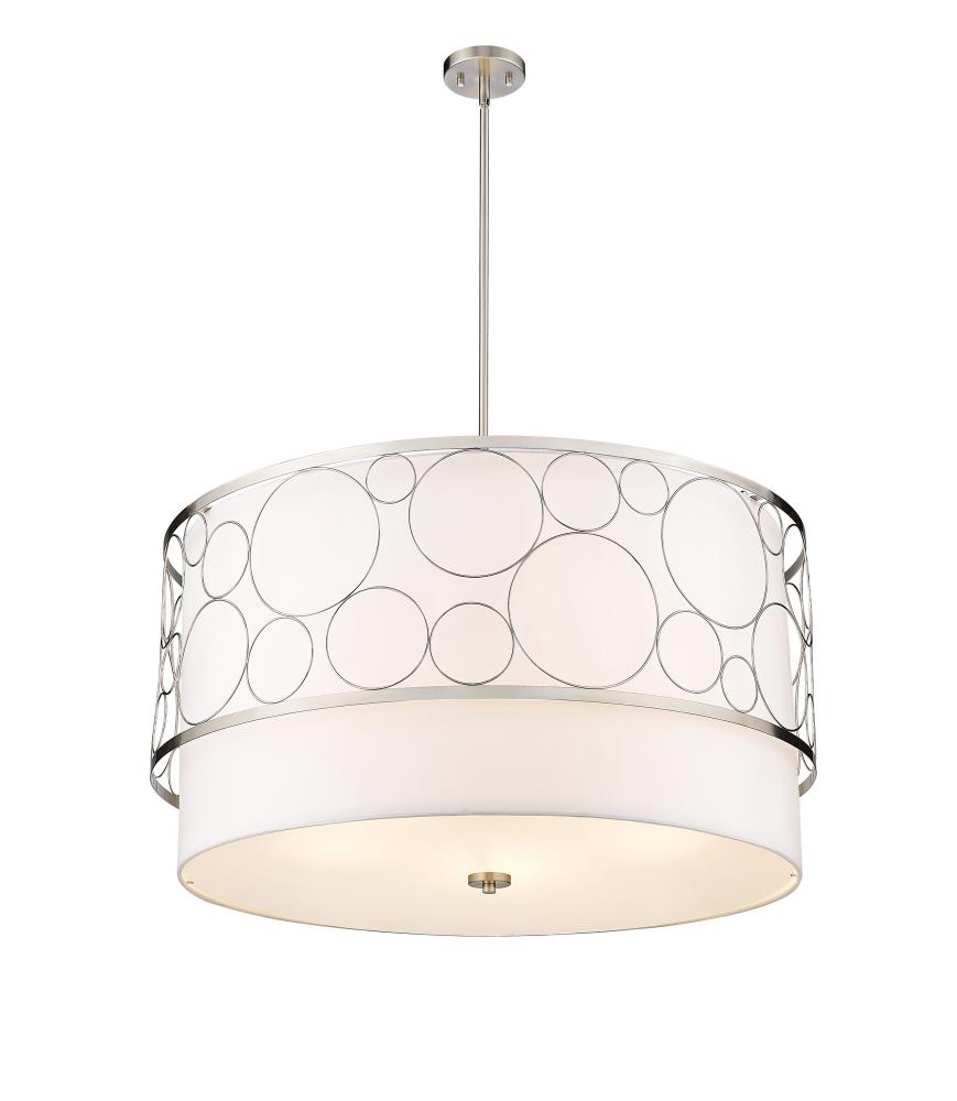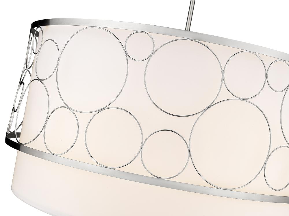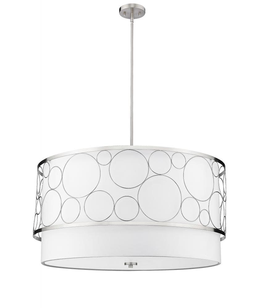 A sophisticated touch to spacious interiors like dining rooms and open concept living rooms, this modern five-light pendant boasts a tiered drum shape design that offers both style and grace. Open ringlets compress against one another to create an outer cage, elevated by a shiny brushed nickel finish. Behind it, a white fabric shade puts off a serene, captivating glow, casting a gorgeous silhouette across the space.