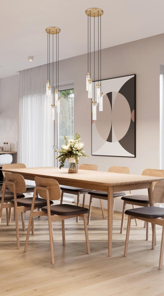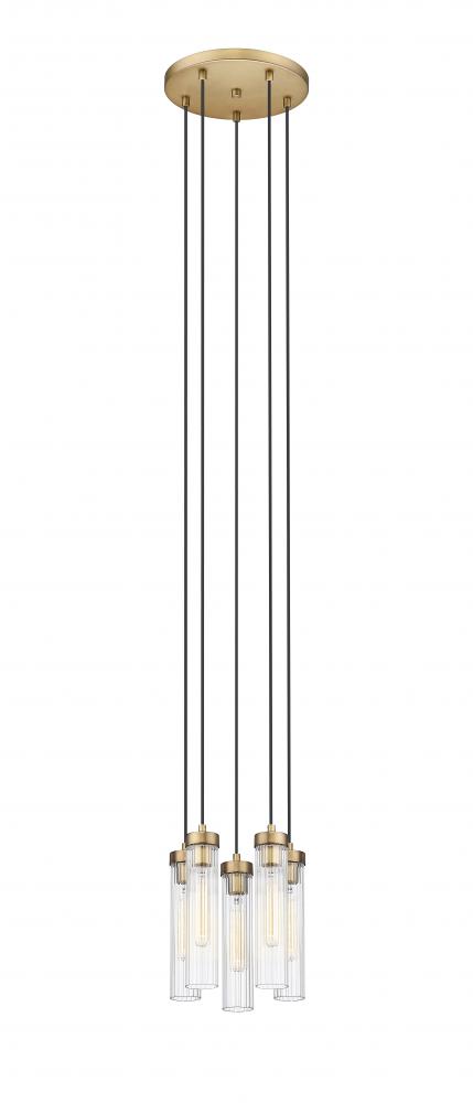 Iconic elegance is formed of a marriage between metal and glass shows gallery influence in this five-light round chandelier. Embrace the artisan glam and minimalist sensibility of a fixture featuring delicate fluted glass shades that dangle at graduated lengths from a rich rubbed brass finish metal canopy and contribute optical intrigue. This tasteful chandelier serves as a pendant for compact spaces including nooks, enclaves, and entryways.