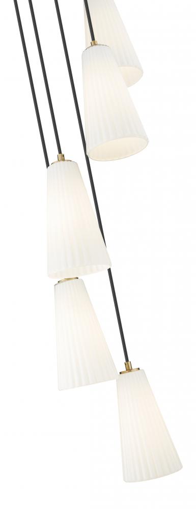 Introduce a sense of elegance and artistry with a modern five-light chandelier from the Farrell collection. Its spiraling presentation of five fluted, frosted glass shades creates a delicate fall of luminosity. A modern gold accent finish adds depth and warmth, perfect for a dining room, foyer, or over a staircase.
