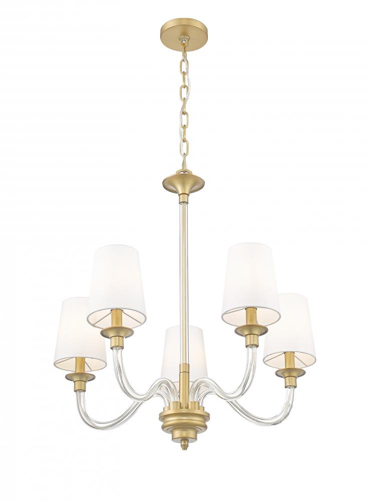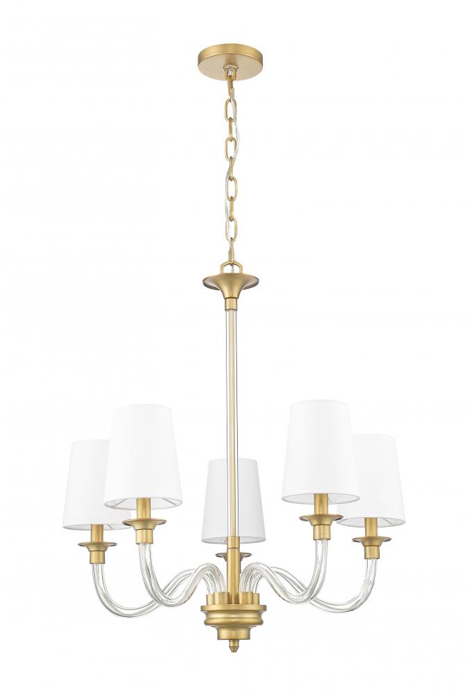 Serpentine arms are fashioned in delicate glass to create a fresh, refined profile for this modern five-light chandelier. A rubbed brass finish highlights its decorative elements and adds wonderful warmth and sophistication. Lights are set under tapering white fabric shades, casting beautiful illumination over your living or dining room.