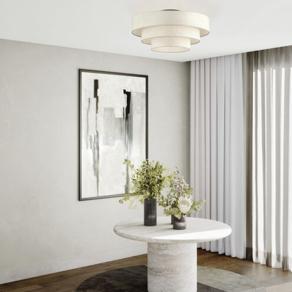 No room is too big or too small for the ambient, modern Manorwood lighting collection, given its extensive line-up of ceiling and wall light models in round and linear styles. Featuring minimalist metal frames (available in several mood-setting metallic finishes), the versatile Manorwood design is centered around handmade hardback shades concentrically stacked in a “wedding cake” style in up to 4 tiers.
