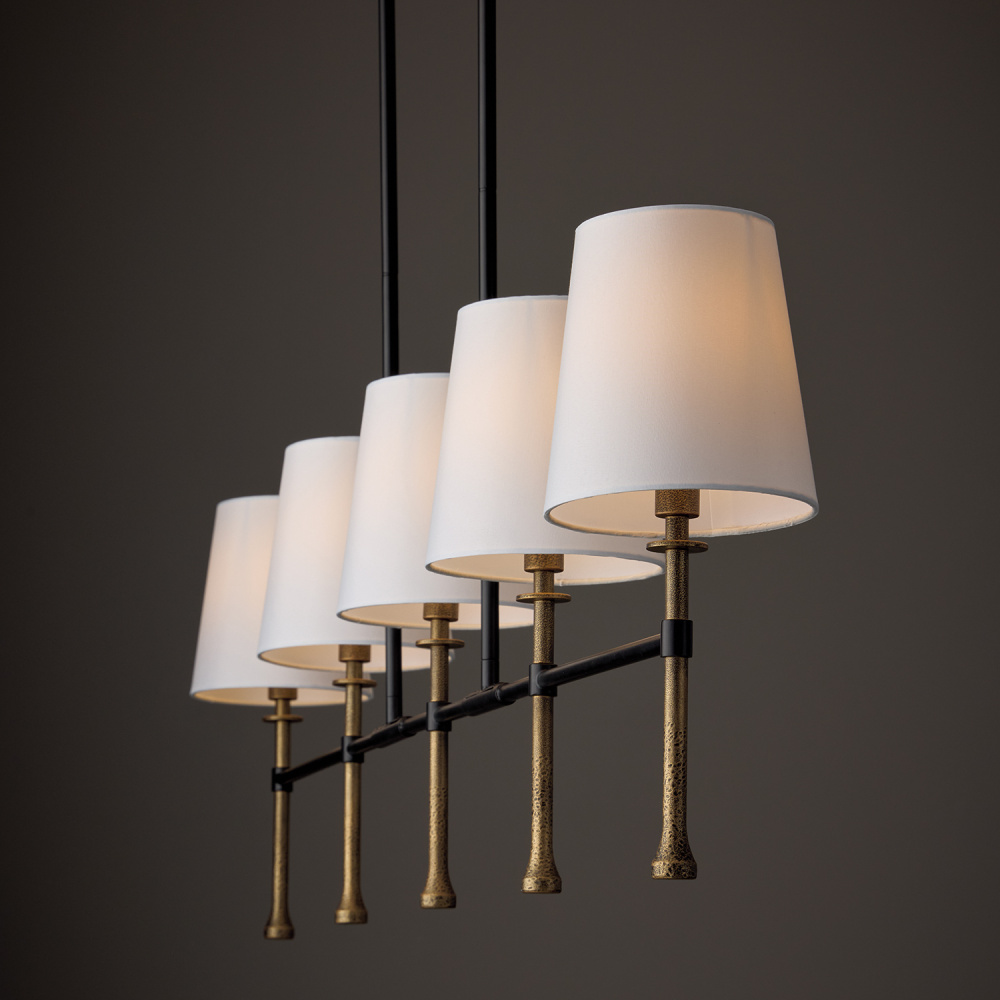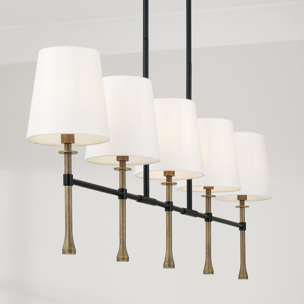 A fresh take on transitional design, the Hollis Linear Chandelier adds two-tone appeal and a touch of texture to a classic silhouette. This fixture seamlessly blends Matte Black with the textural, handcrafted Hammered Gold finish on the finials. Mini disc bobeche details draw the eye, while tapered White Fabric shades round out the style.