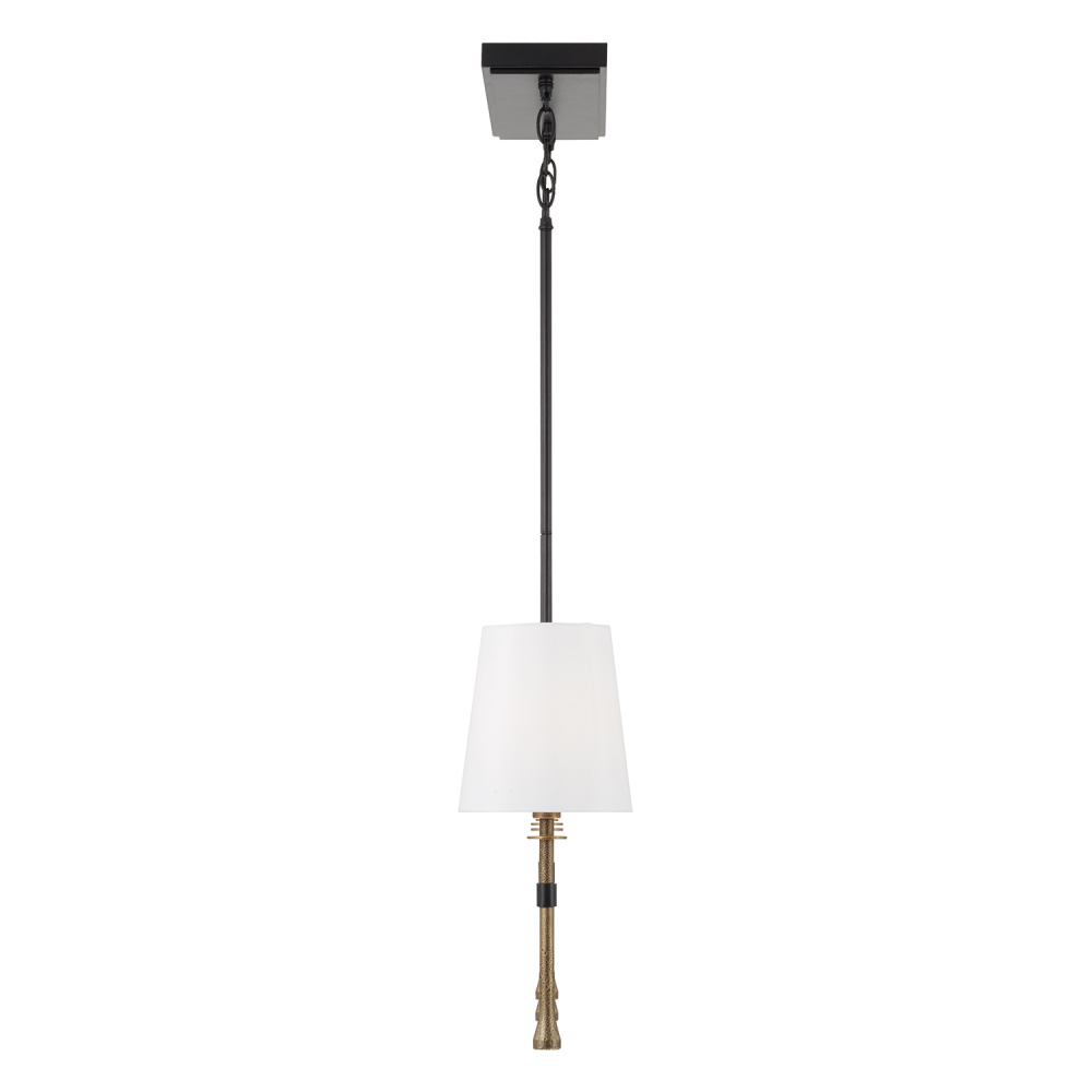 DETAILS: Classic White fabric shades are beautifully balanced by the two-tone finish of a handcrafted Hammered Gold on the arms, finials, and disc details, plus Matte Black on the rest.