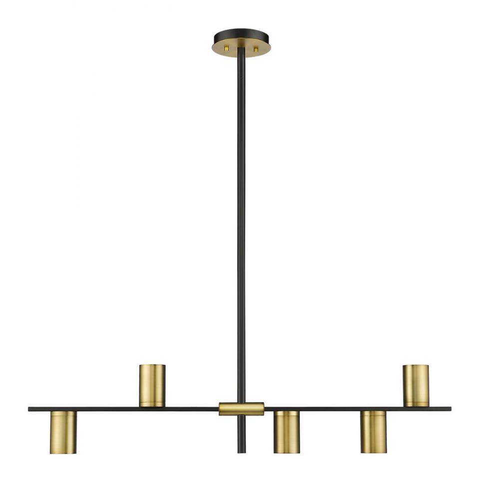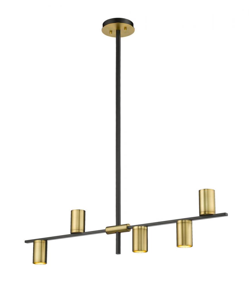 An orderly silhouette delivers industrial-inspired charm to this five-light island and billiards light from the Calumet collection. Indulge in an invocation of Native American fare with a motif reflecting tribal heritage, delivering a dynamic look in a modern or transitional space. This light fixture is fashioned of matte black finish steel with warm olde brass finish steel shades sending lighting in an upward and downward direction.