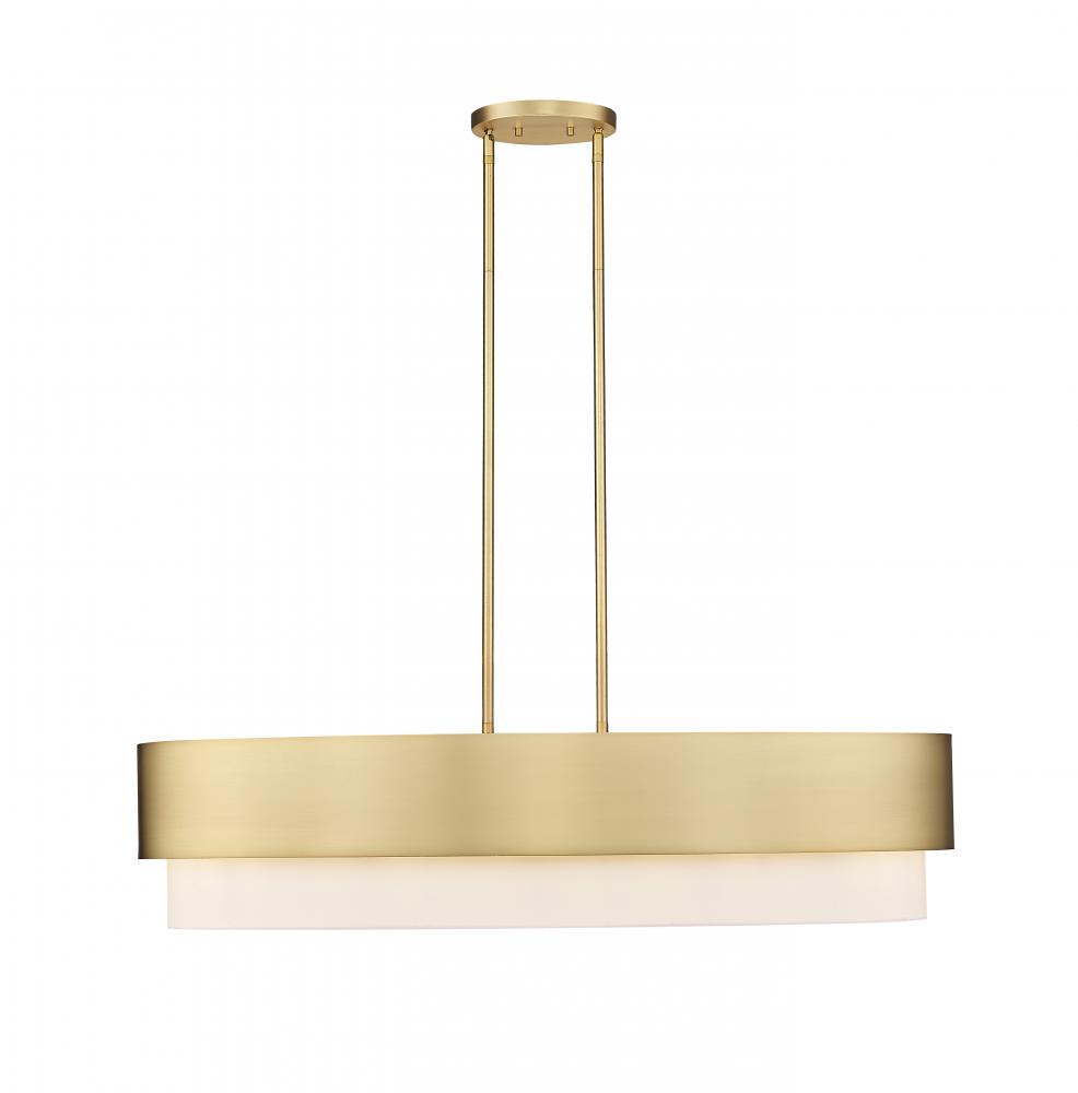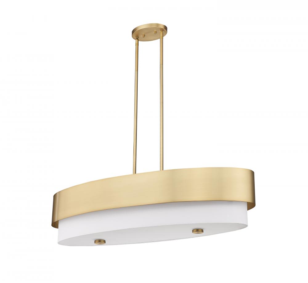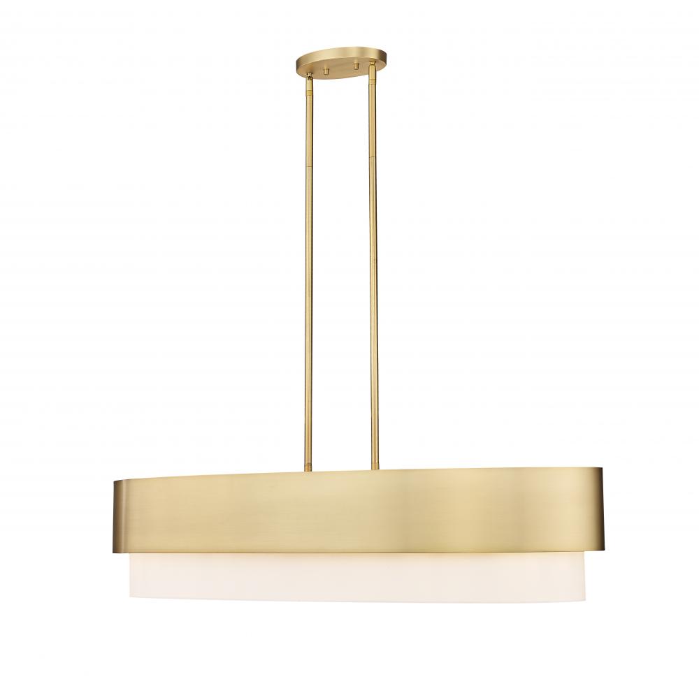 Light up a transitional kitchen island or entertaining space with a fixture featuring smooth lines and a lustrous mix of finishes. This five-light island light from the Counterpoint collection offers an understated elegance, blending modern gold finish steel framing with a sleek white fabric shade. Its oval silhouette delivers an artisanal invocation of Mid-Century Modern style and a graceful look perfect for any living space.